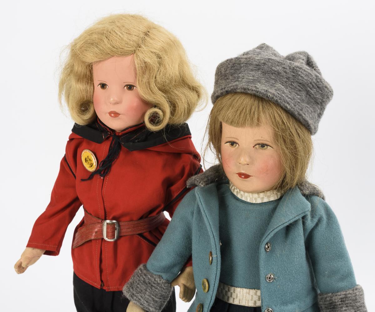 2 Puppen "Deutsches Kind" mit Schlitten und Skiern. Käthe Kruse, VEB, Typ VIII.