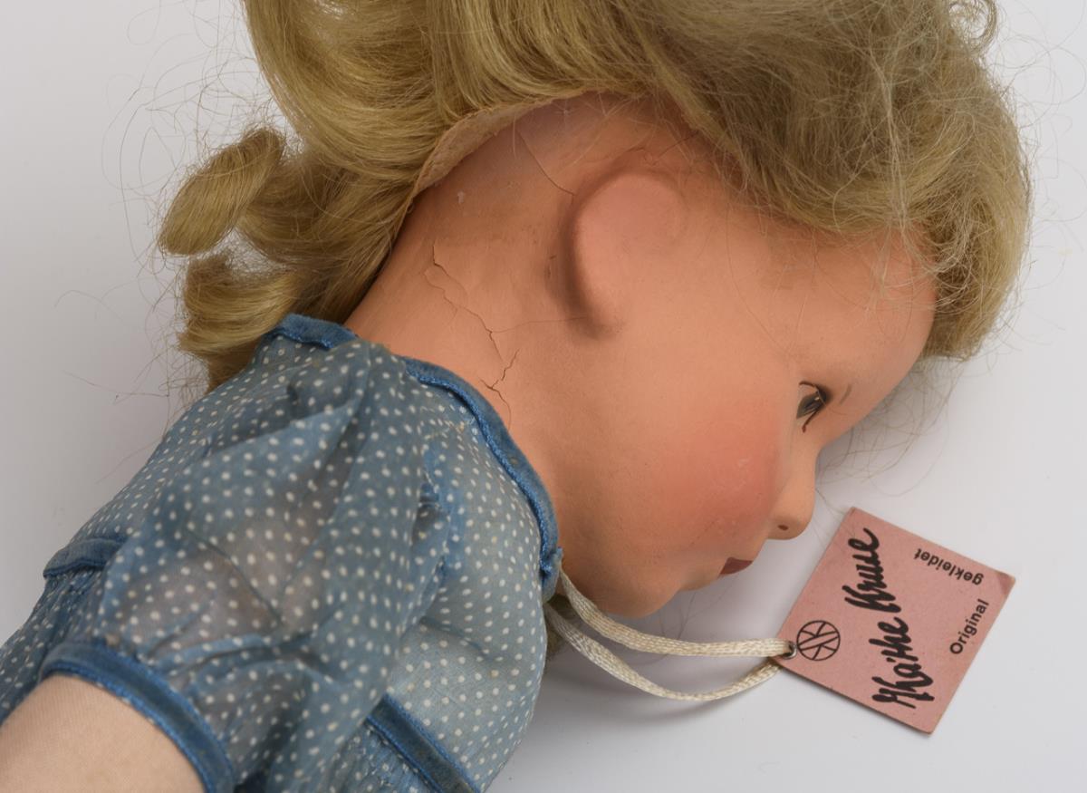 Nesselbezogener Kopf mit 1 Hinterkopfnaht, gemalte blaue Augen, blonde Mohairperücke. Stoffkörper mit locker angenähten Armen, Beine mit Scheibengelenken. Originales blaues Kleidchen, Unterwäsche, weiße Schuhe. Im Originalkarton mit Defekt am Deckel. Farbe am Hals rissig, leuchtet nicht unter UV-Licht.