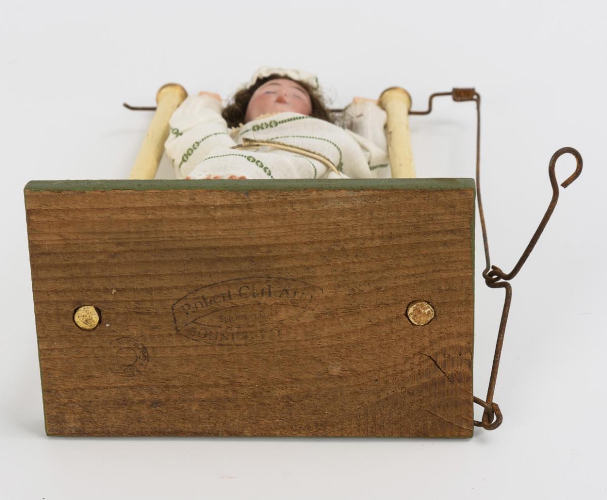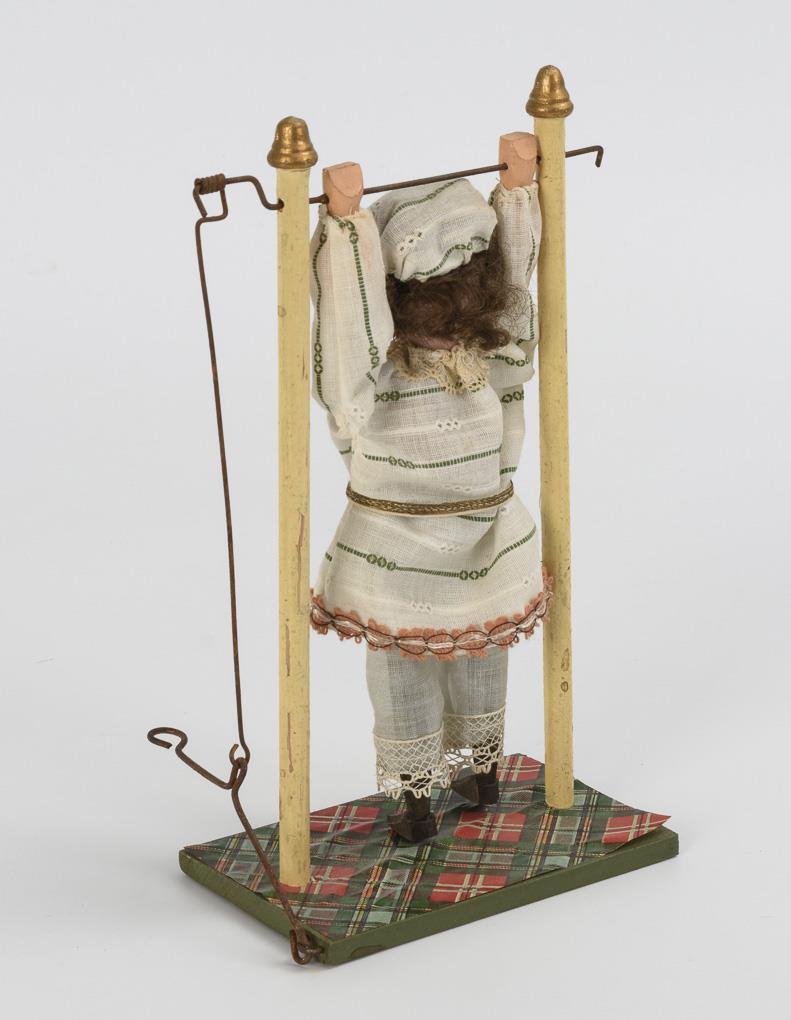 Turnerin am Reck, mit Kurbelkopf, gemalten blauen Augen, Mohairperücke und Holzkörper. Durch Betätigung eines Drahthebels schwingt die Figur sich in die Höhe. Intakt, mit Altersspuren.