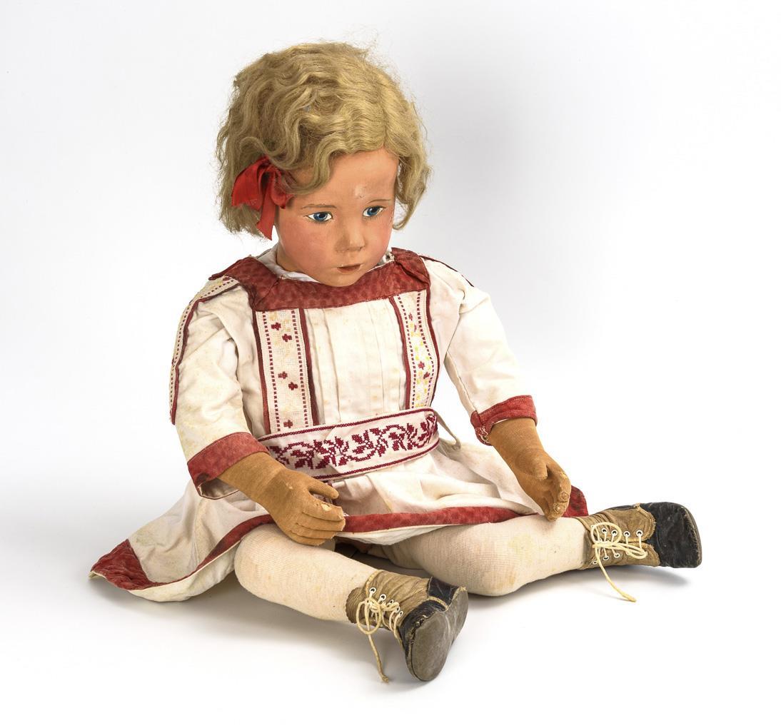 Bemalter Magnesit-Kopf, blaue Augen, blonde abknöpfbare Mohairperücke. Sitzkörper aus Trikotstoff. Weißes Kinderkleid mit roten Borten, alte schwarz-weiße Kinderschuhe. Auf altem Stühlchen sitzend. Kopf mit Bestoßungen und Retuschen, Finger mit kleinen Defekten im Stoff.