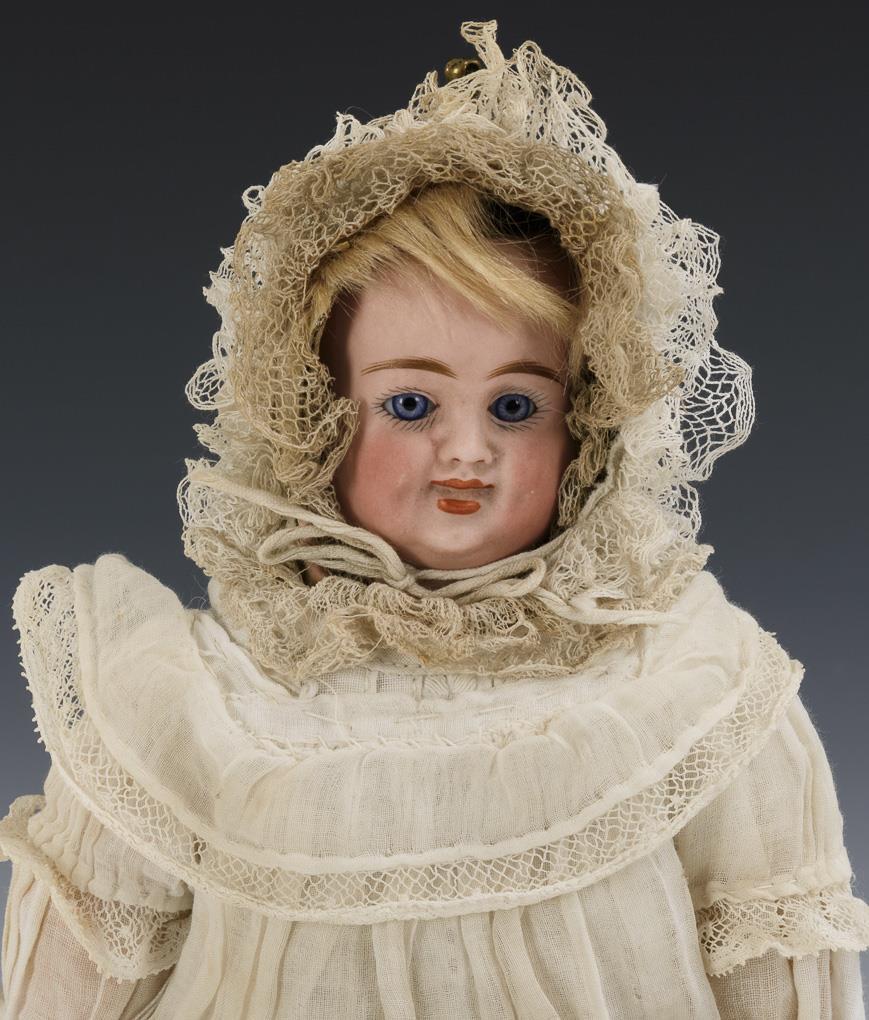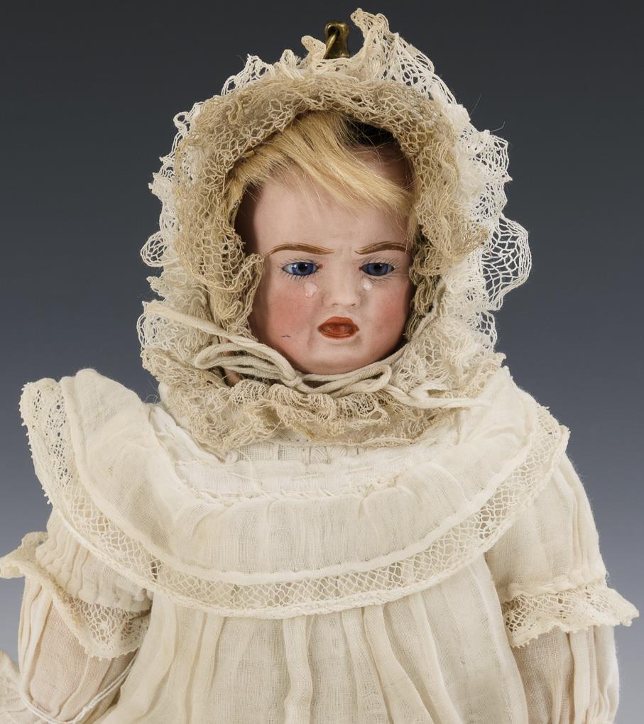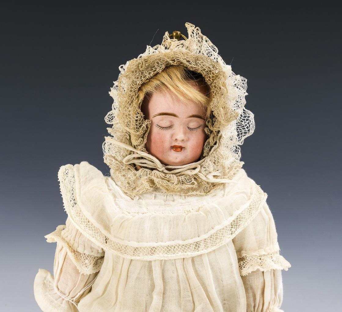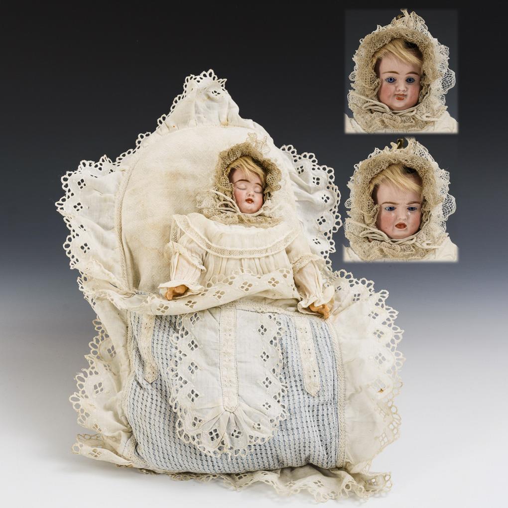 Drehbarer Kopf mit schlafendem, lachendem und weinendem Gesicht. Pappkörper mit Massegliedern und intakter Stimme, in Originalkleidung und Steckkissen. Gute Erhaltung.