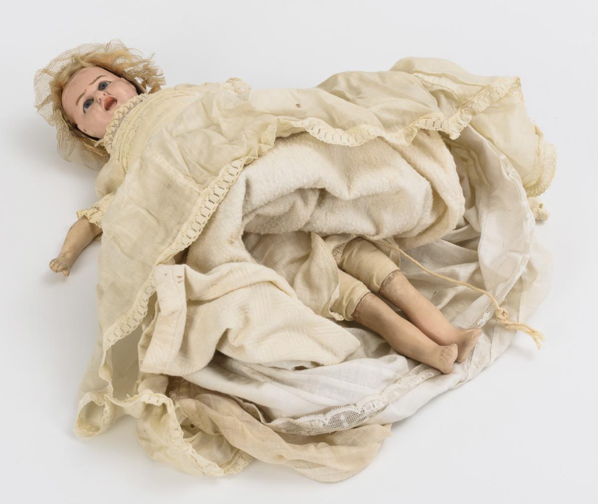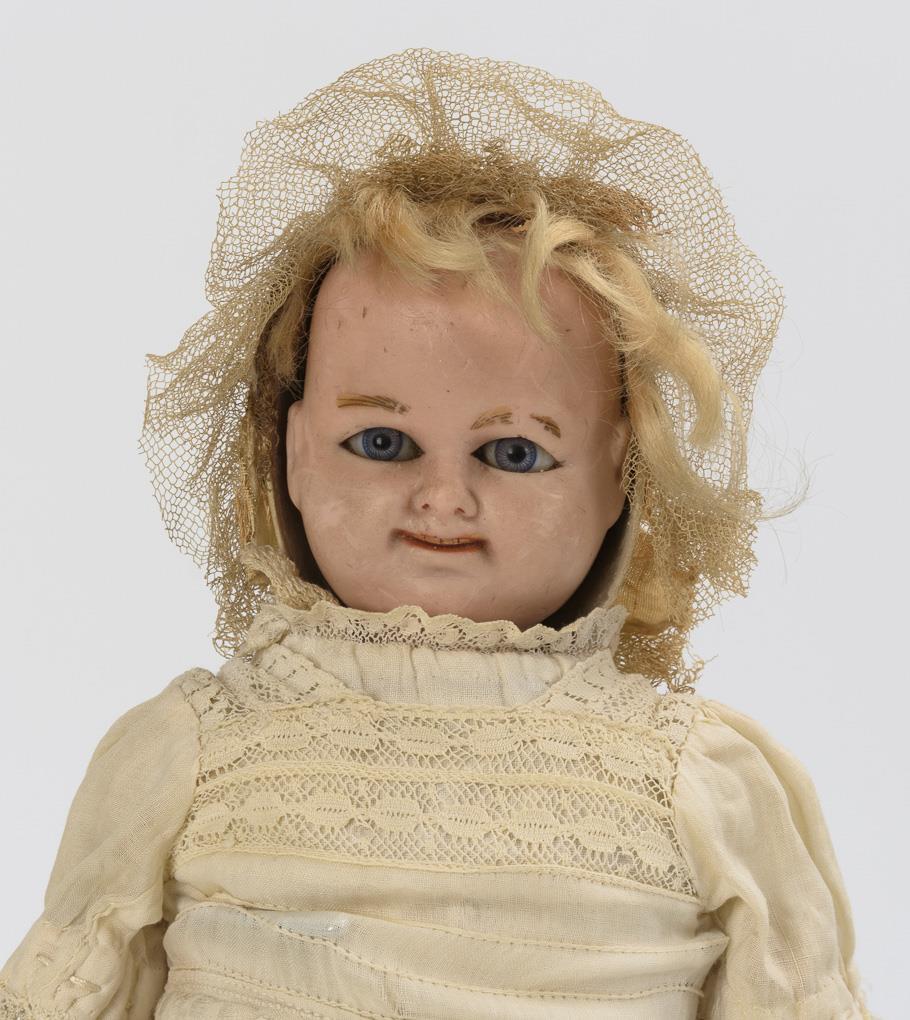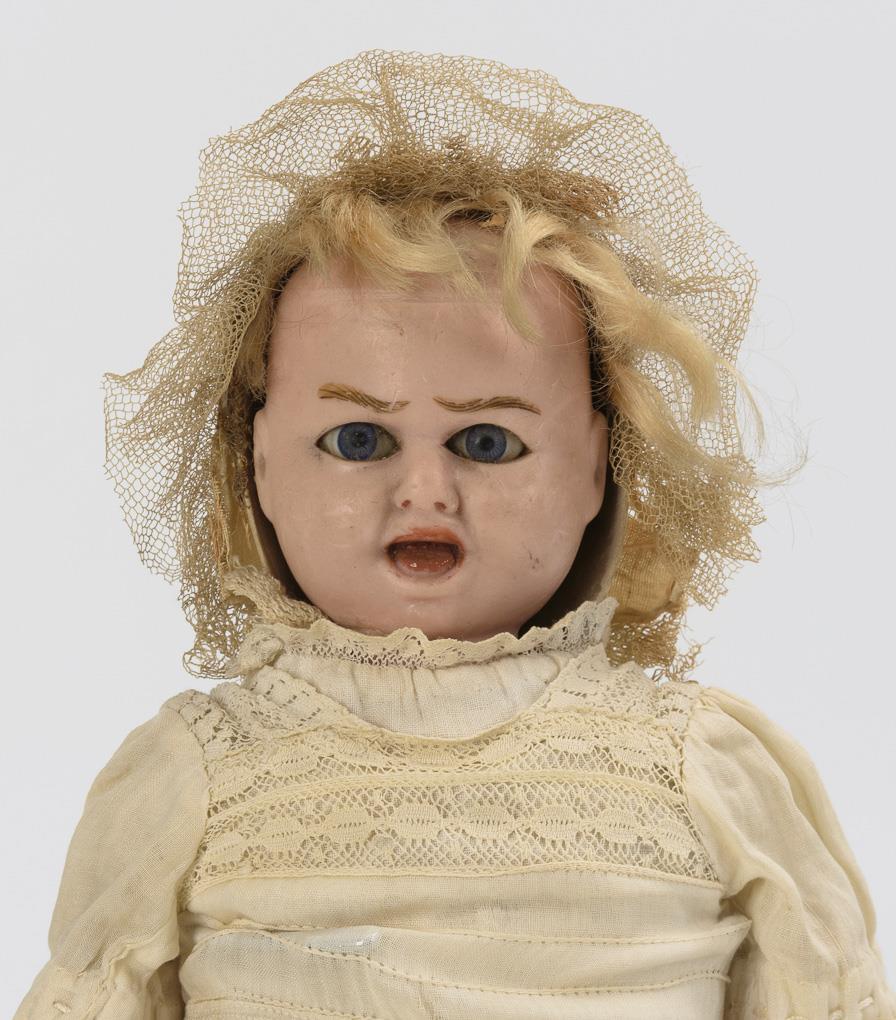 Wachsierter Papiermachékopf, feste blaue Augen, blonde Mohairstirnhaare; mit lachendem und weinendem Gesicht. Stoffkörper mit Massegliedern und intakter Stimme. Altes, langes weißes Kleid, originale Haube. Reparatur am Hals des weinenden Babys, Altersspuren.