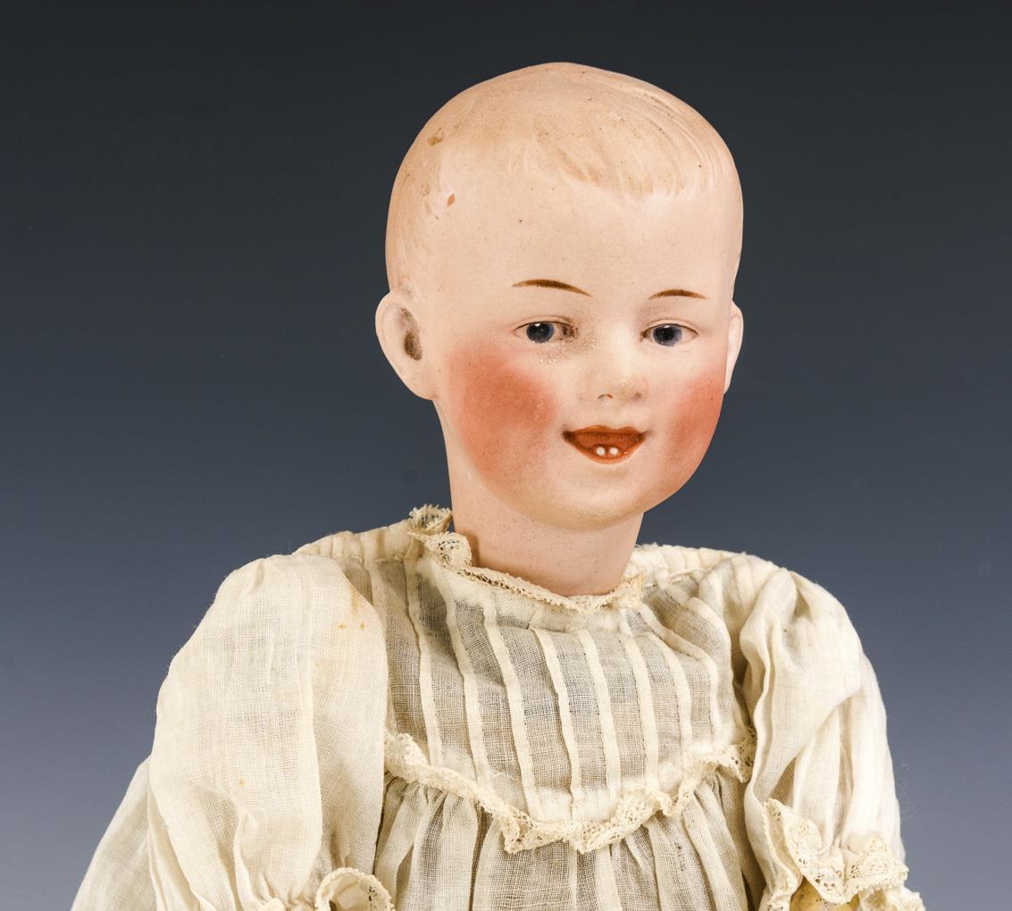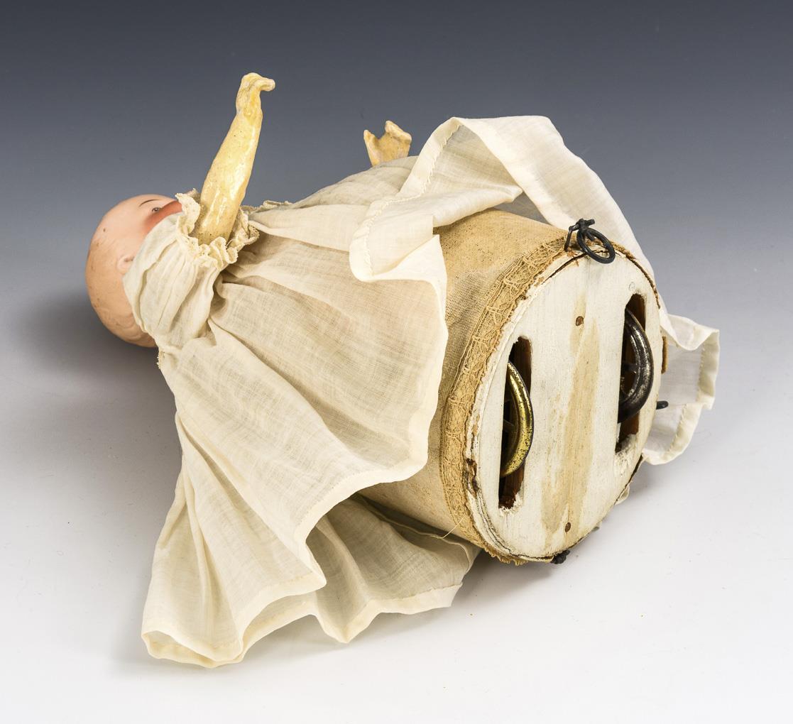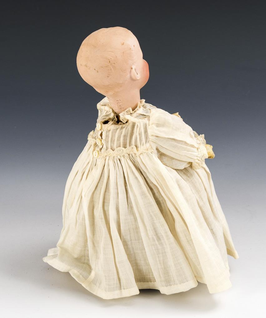 Charakter-Kurbelkopf mit offen/geschlossenem Mund und gemalten Zähnchen. Auf Pappkorpus mit Rädern, originales Kleidchen. Mit frontseitiger Öse, als Nachziehspielzeug verwendbar. Mechanik läuft (revisionsbedürftig), mit festem Schlüssel. Keine Defekte sichtbar.