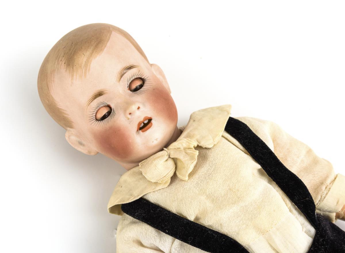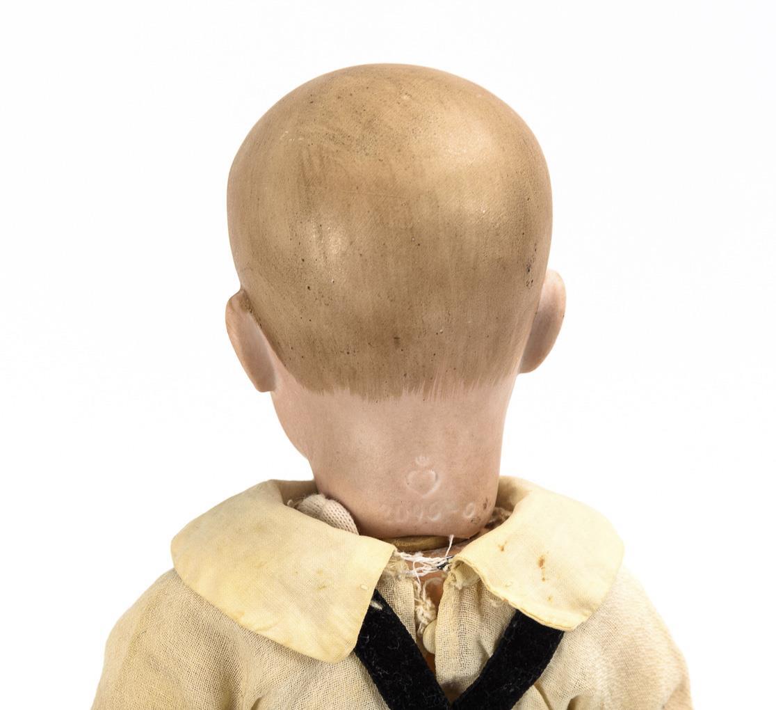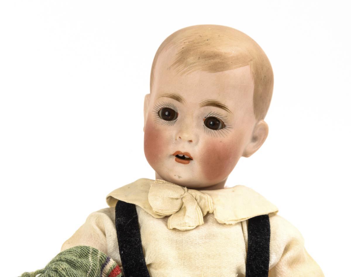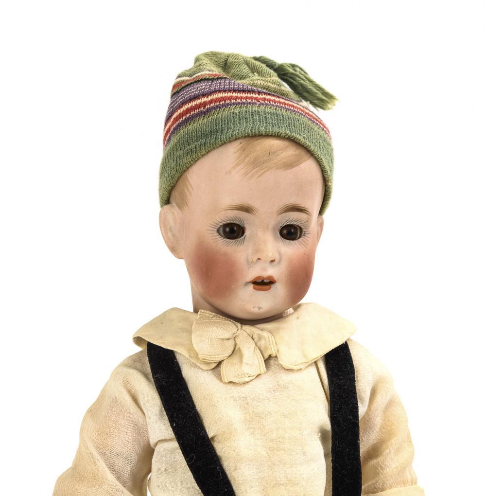 Kurbelkopf, braune Schlafaugen, hellbraune Haare mit modellierter Stirnlocke. 11-teiliger Gliederkörper. Alt bekleidet mit schwarzer Samthose, geringelter Mütze, Hemd, Strümpfen und Schuhen. Kopf ohne sichtbare Defekte. Linker Fuß übermalt (wohl fachgerecht restaurierter Bruch).