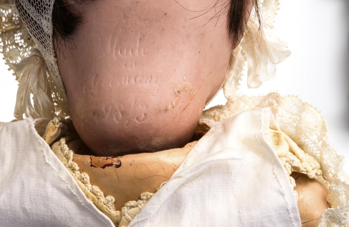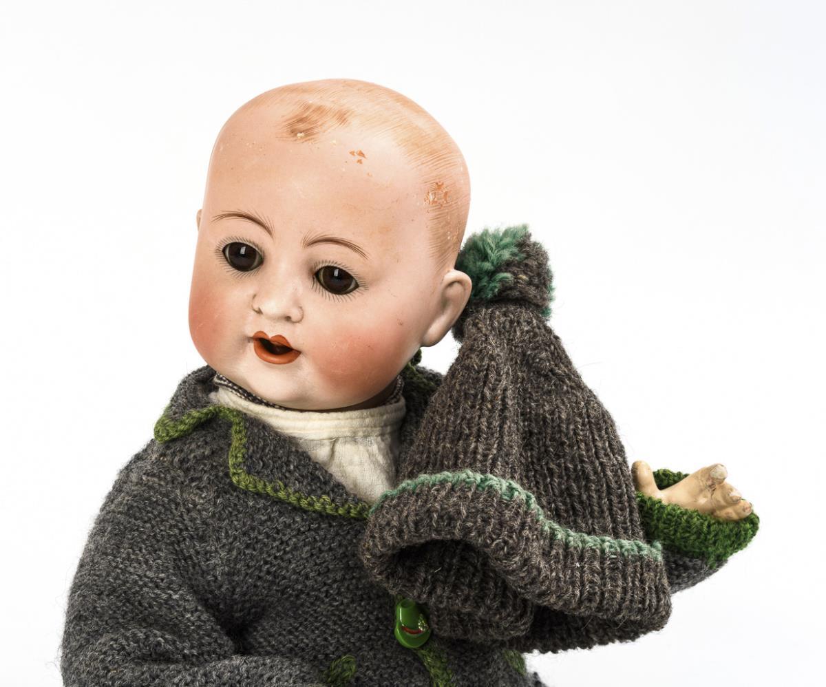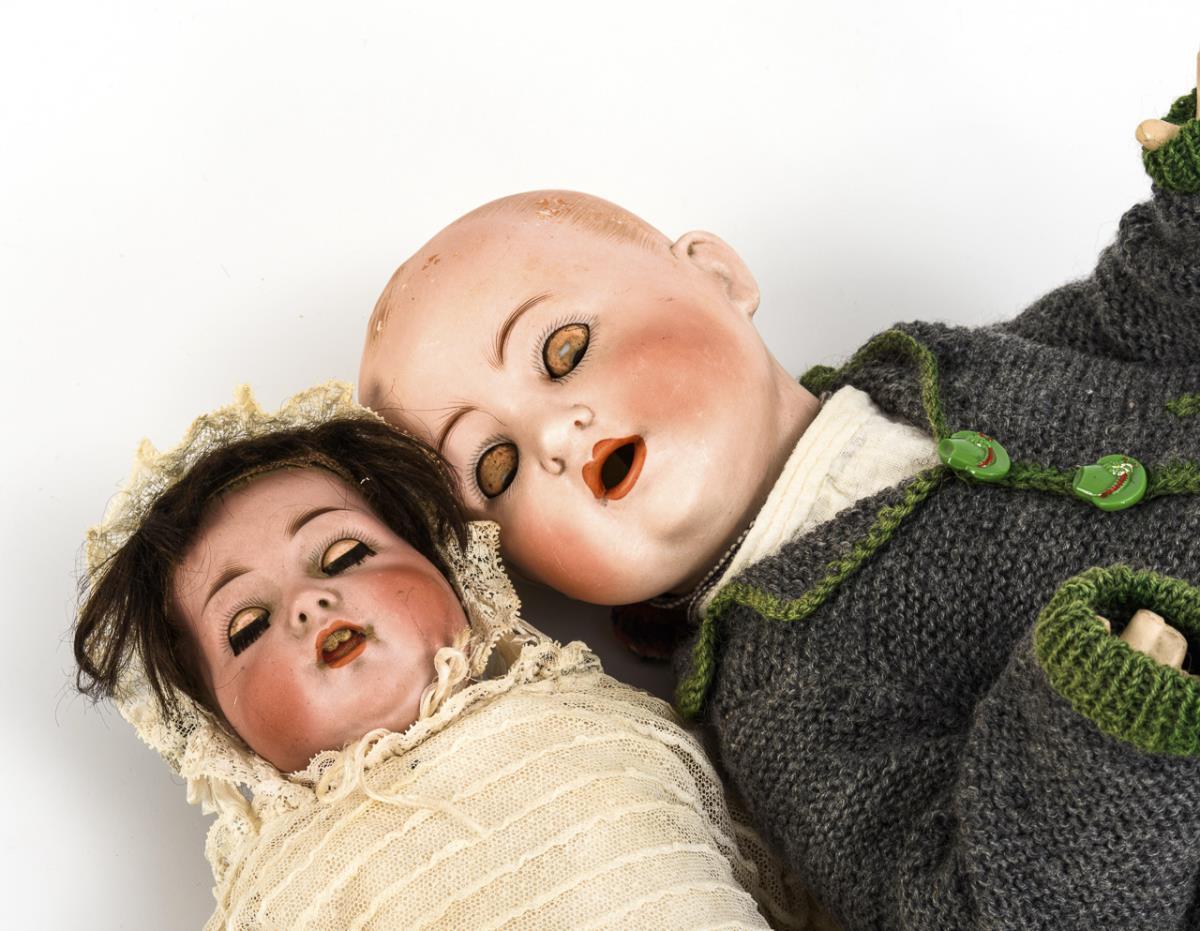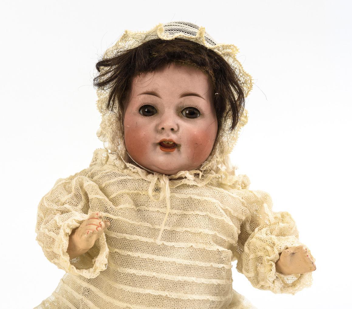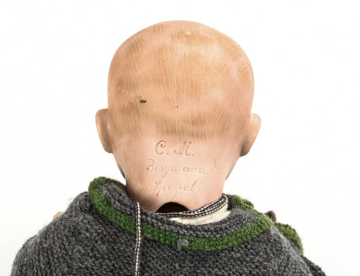 1x Hertel, Schwab & Co für König & Wernicke, (gemarkt "Made in Germany 98/3"): Kurbelkopf, braune Schlafaugen, Wimpern, offene Nasenlöcher, braune Echthaarperücke, 5-teiliger Babykörper, weißes Kleid, passende Haube. Haarriss am Kopf. L 33 cm. / 1x Vollkopfbaby (gemarkt "C.M. Bergmann Spezial"): braune Schlafaugen, Zunge, gemalte Haare, 5-teiliger Sitzbabykörper, grauer Strickanzug und Mütze. Leichter Perückenpull, Hände ausgebessert, Körper übermalt. L 42 cm..