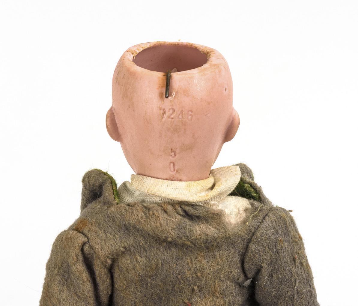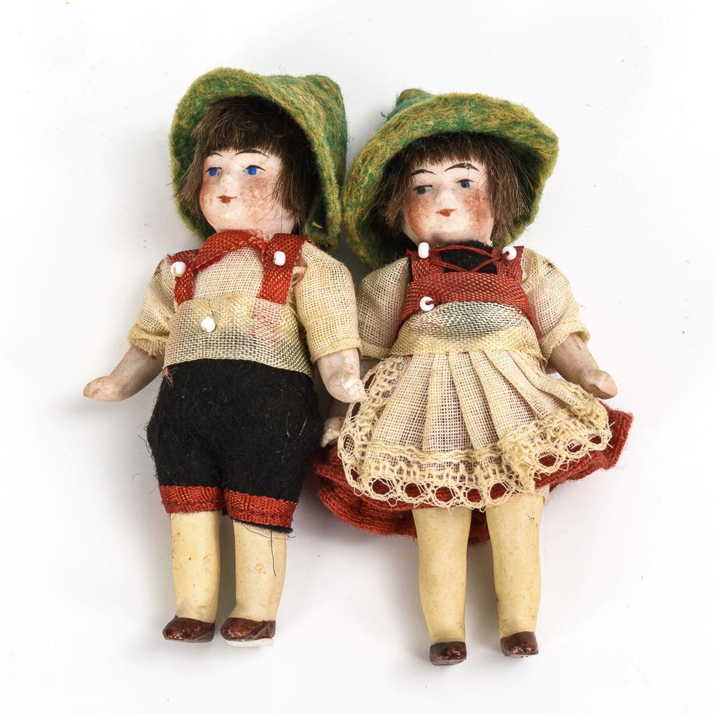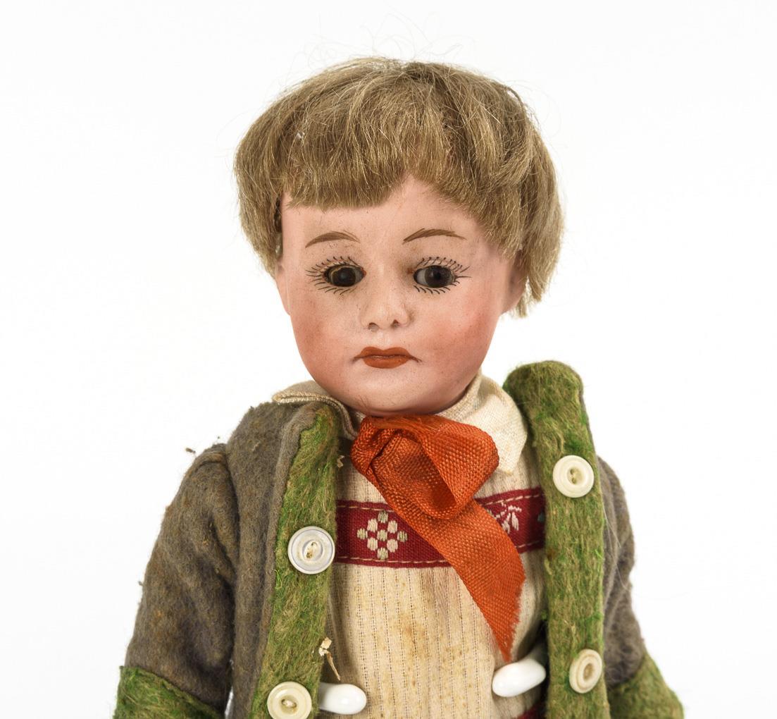 Charakterjunge Typ "Pouty" mit Kurbelkopf, blauen Schlafaugen, geschlossenem Mund, blonder Mohairperücke und original bekleidetem Stehpuppenkörper. Haarriss an der Stirn. L 23 cm. / 2 kleine Ganzbiskuit-Püppchen mit gemalten blauen Augen, bekleidet in Tracht. L je 9 cm.