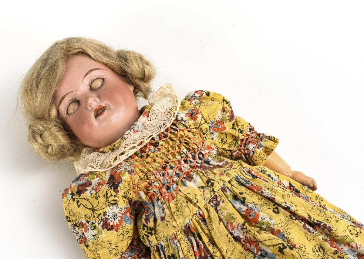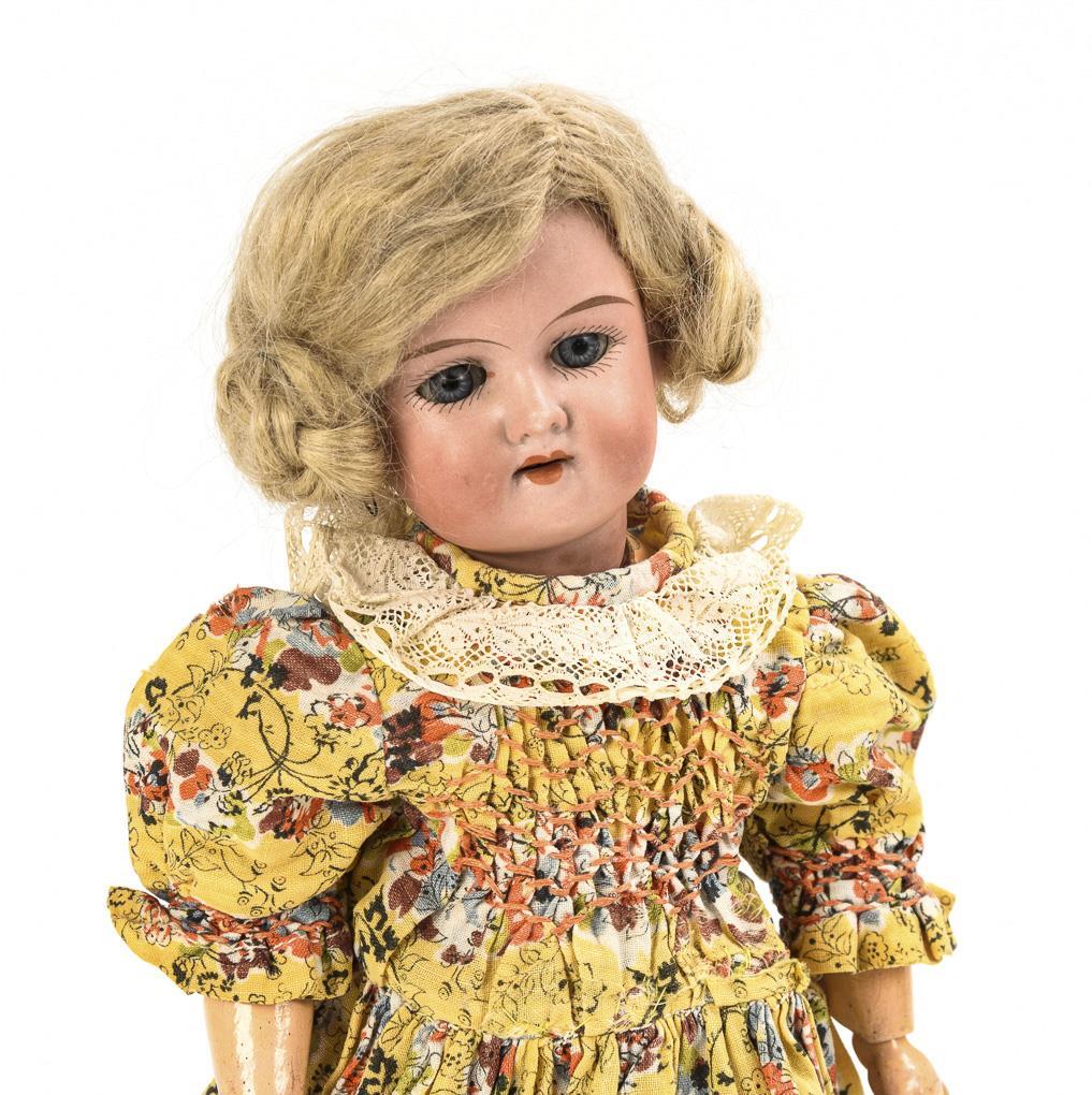 Blondes Gliedergelenkmädchen mit Kurbelkopf, blauen Schlafaugen, Mohairperücke, originalem gelbem Kleid, Ringelstrümpfen und braunen Lederschuhen. Kopf nicht durchleuchtet: keine Defekte sichtbar. Körper mit Farbdefekten.