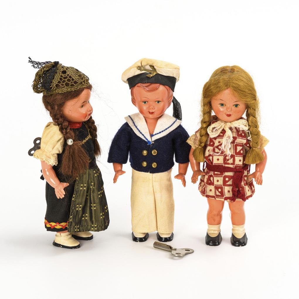 Alle original bekleidet: blondes Mädchen, Mädchen in Tracht und Junge als Matrose. Werke intakt, jeweils mit Schlüssel. Alle Arme lose.