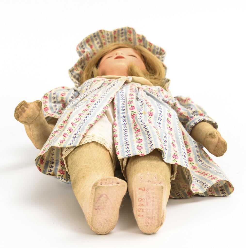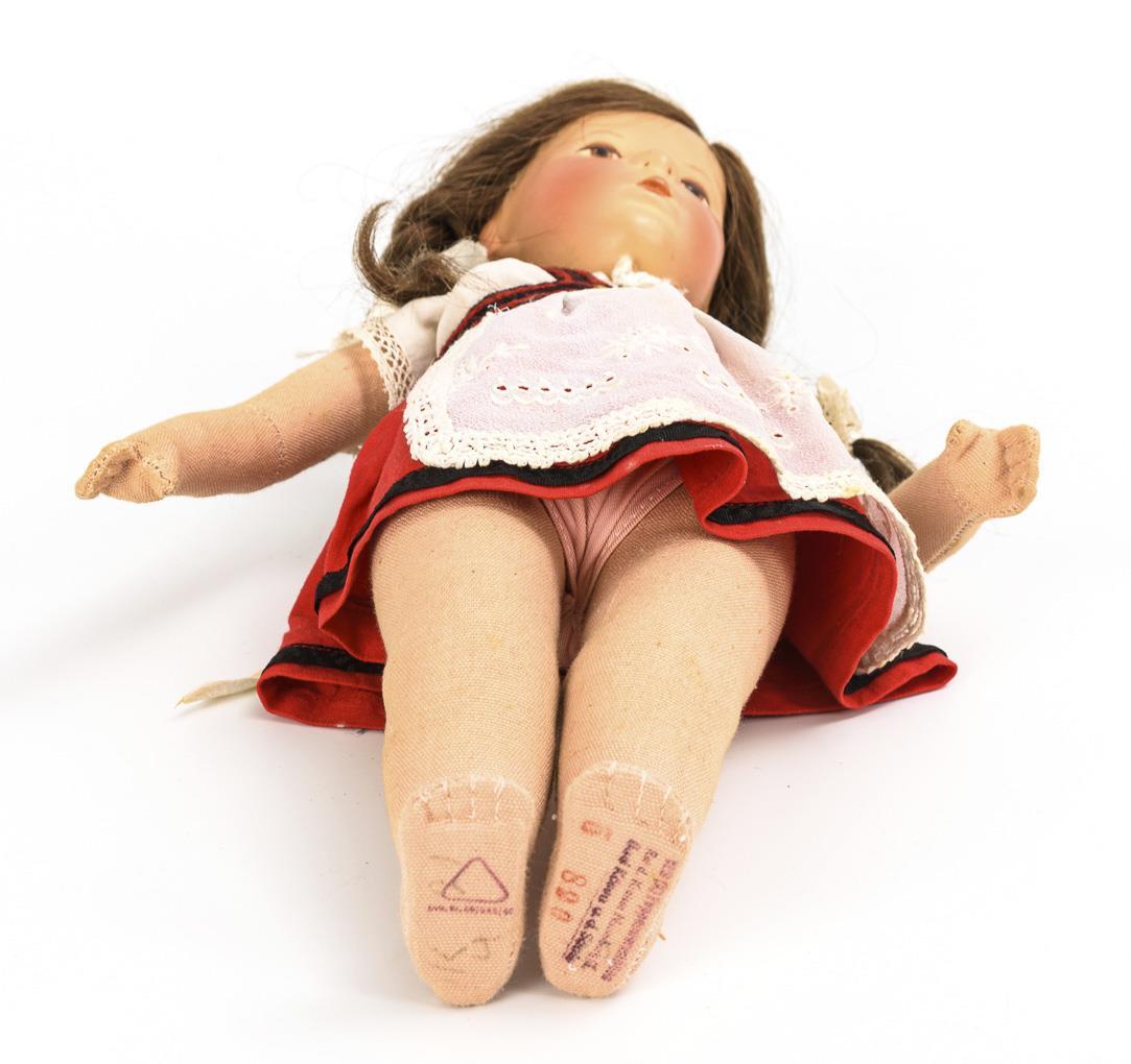 Beide mit Kurbelkopf aus Kunststoff, gemalten braunen Augen und Echthaarperücke. Körper aus Nessel mit locker angenähten Armen, Beine mit Scheibengelenken und zusätzlicher Knienaht. 1x mit originalem roten Schürzenkleidchen, 1x mit hell geblümtem Kleid und passender Haube. 1x Gesicht berieben.