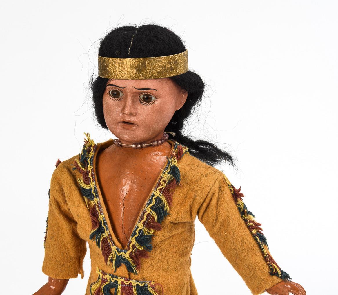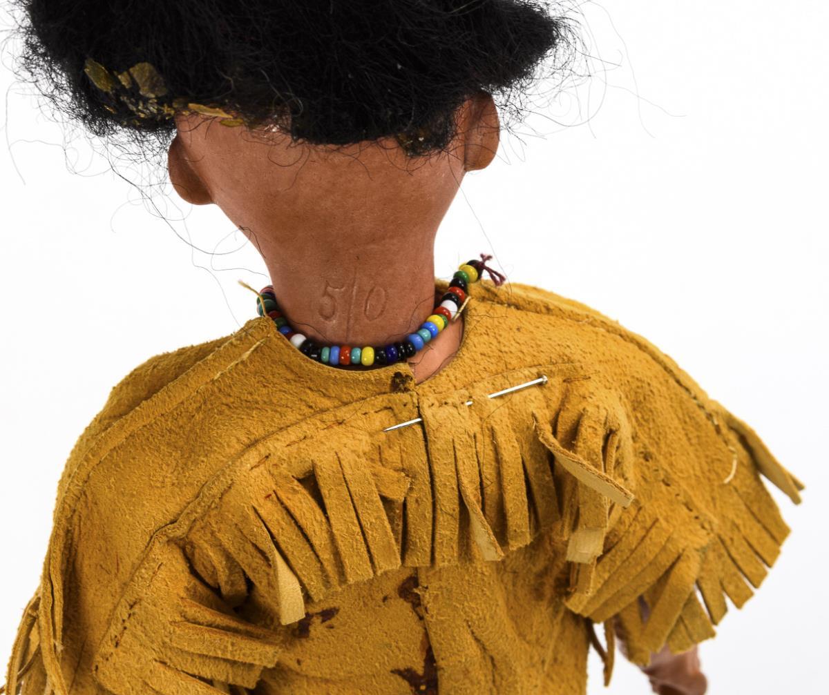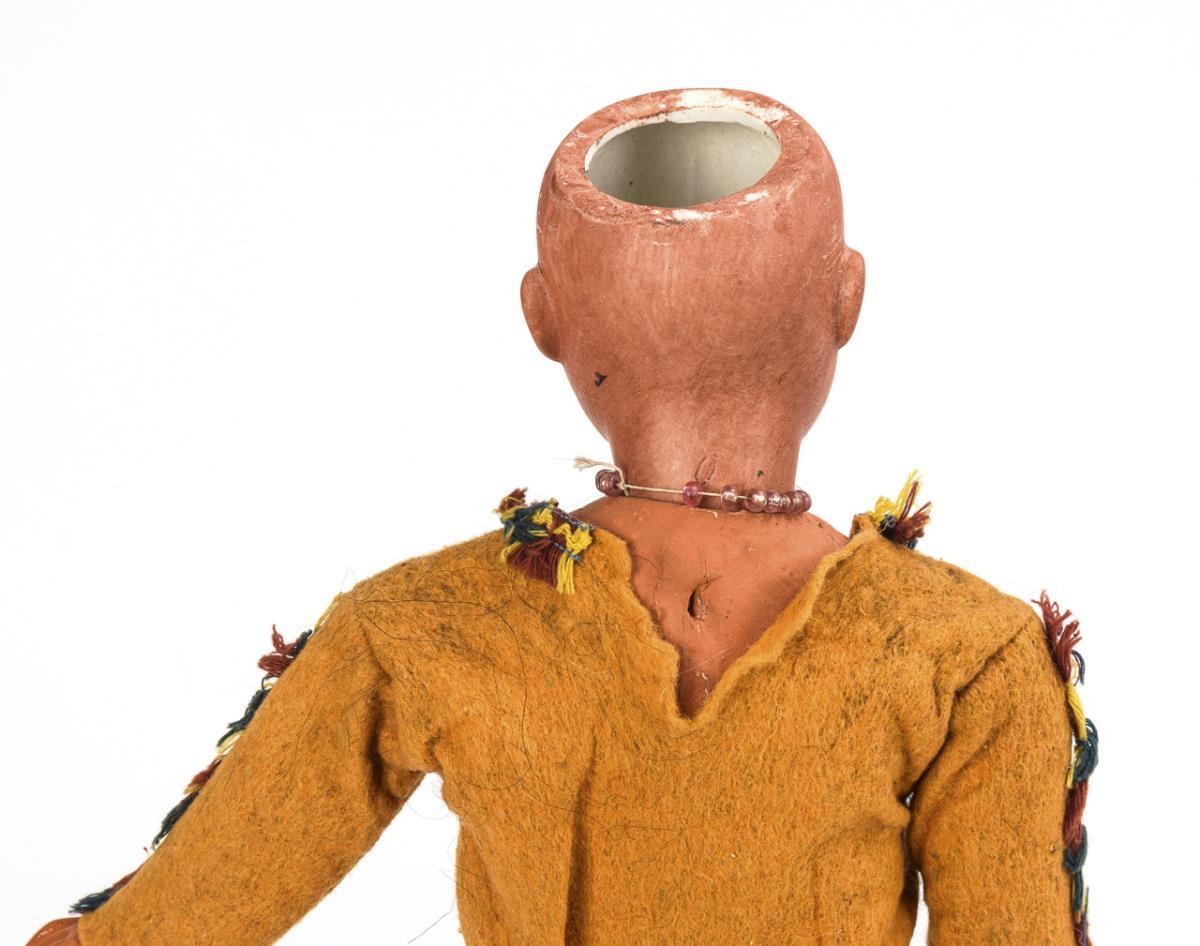Beide mit getöntem Kurbelkopf, festen braunen Glasaugen, schwarzer Mohairperücke, Pappkörper und Massegliedern. Frau in originalem Kleid (L 38 cm), kleinere Puppe mit gelber Lederkleidung in alter Art (L 27 cm). Kopf der Frau durchleuchtet: ohne Defekte, Körper mit Riss im Brustbereich. Kopf der kleineren Puppe nicht durchleuchtet: keine Defekte sichtbar.