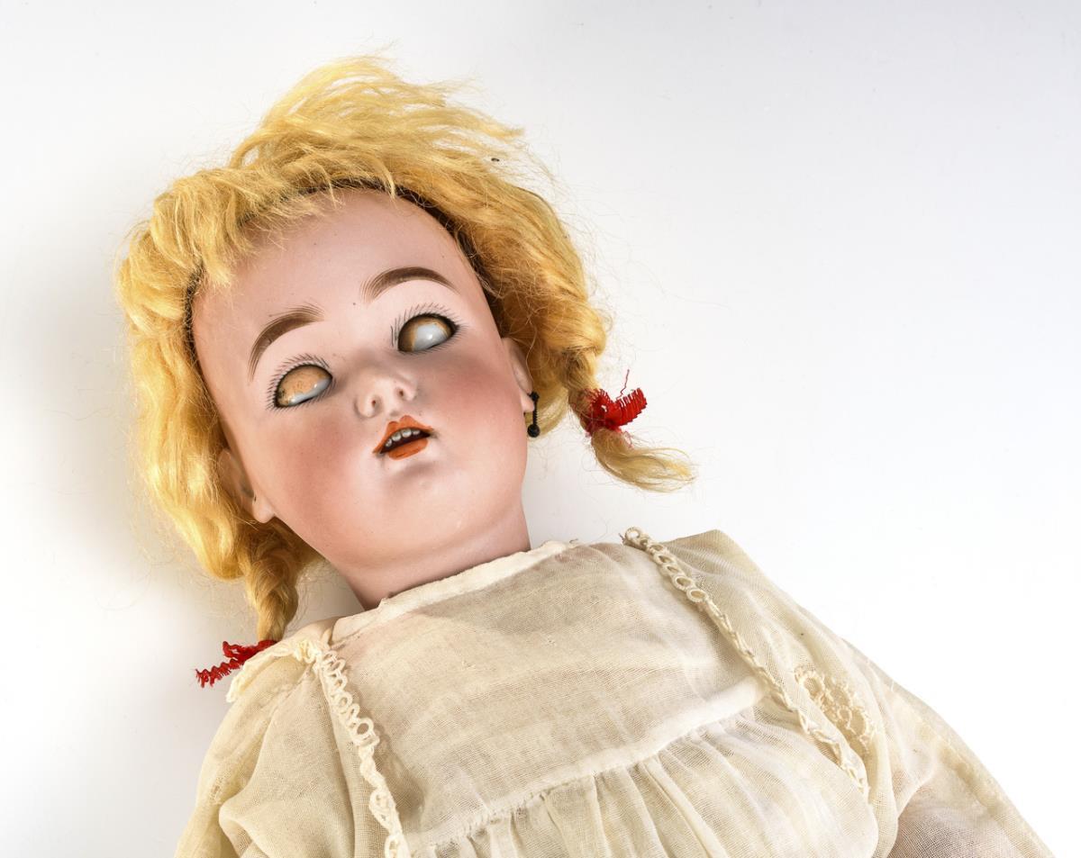 Kurbelkopf, dunkelbraune Schlafaugen, Ohrlöcher, gelbblonde Mohairperücke. 15-teiliger Gliederkörper. Altes weißes Kleid, ohne Schuhe und Strümpfe. Kopf durchleuchtet: ohne Defekte, lediglich winziger Perückenpull an Stirn und Kopfkrone. Fingerspitzen minimal berieben, 1 Finger geklebt.