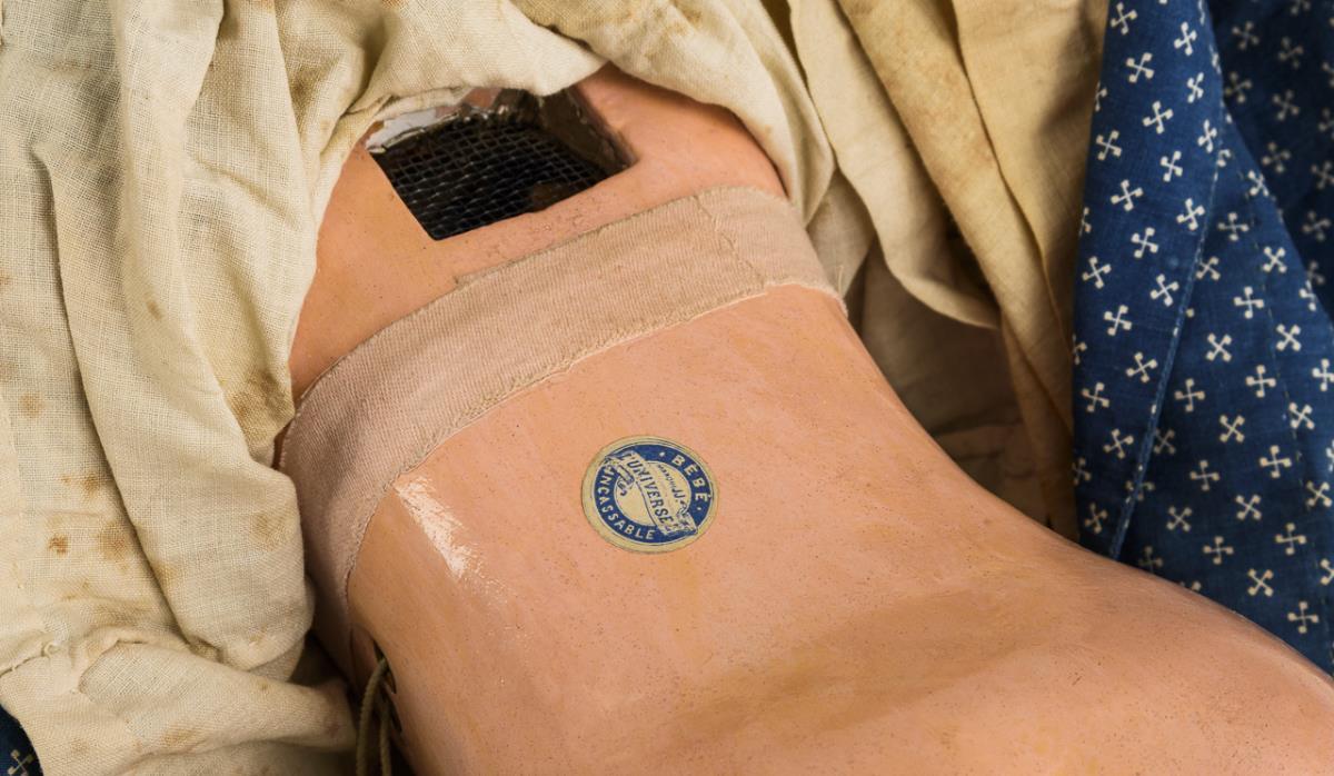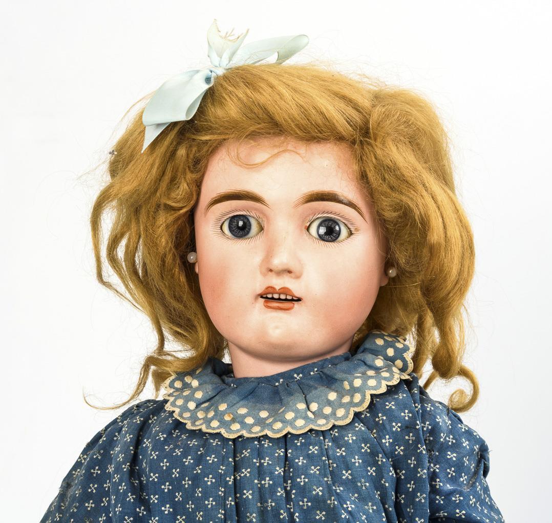 Kurbelkopf, blaue Schlafaugen, Ohrringe, rotblonde Mohairperücke. 11-teiliger Gliederkörper mit intakter Stimme. Altes Blaudruckkleid, Kettentäschchen, weiße Strümpfe, ohne Schuhe. Kopf durchleuchtet: lediglich kurzer Brandriss an der Kopfkrone. Körper übermalt, mit Farbdefekten.