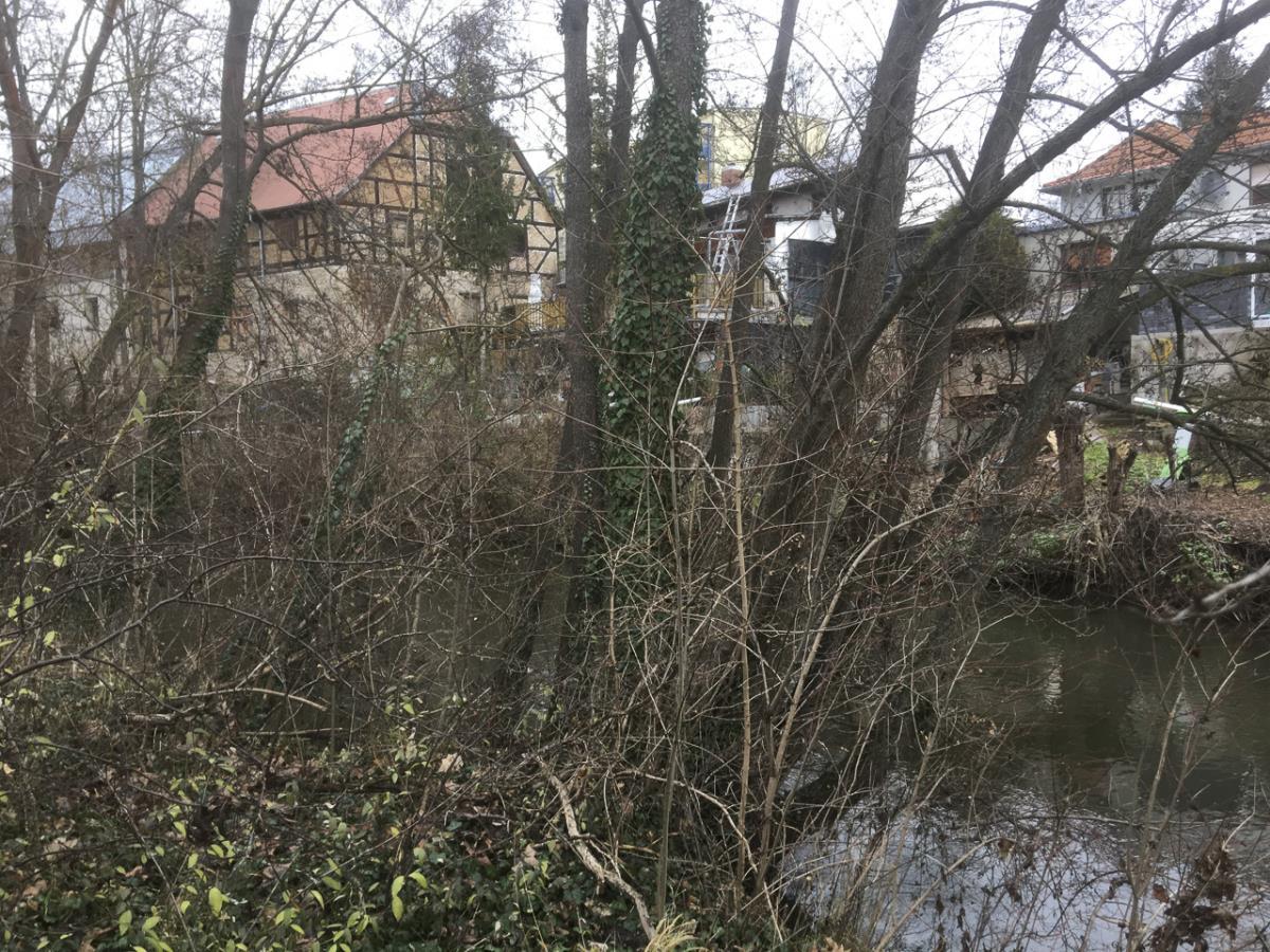 Wäscherinnen an der Ilm in Oberweimar vor den Fachwerkhäusern mit trocknender Wäsche unter wolkigem Himmel. Altersspuren.