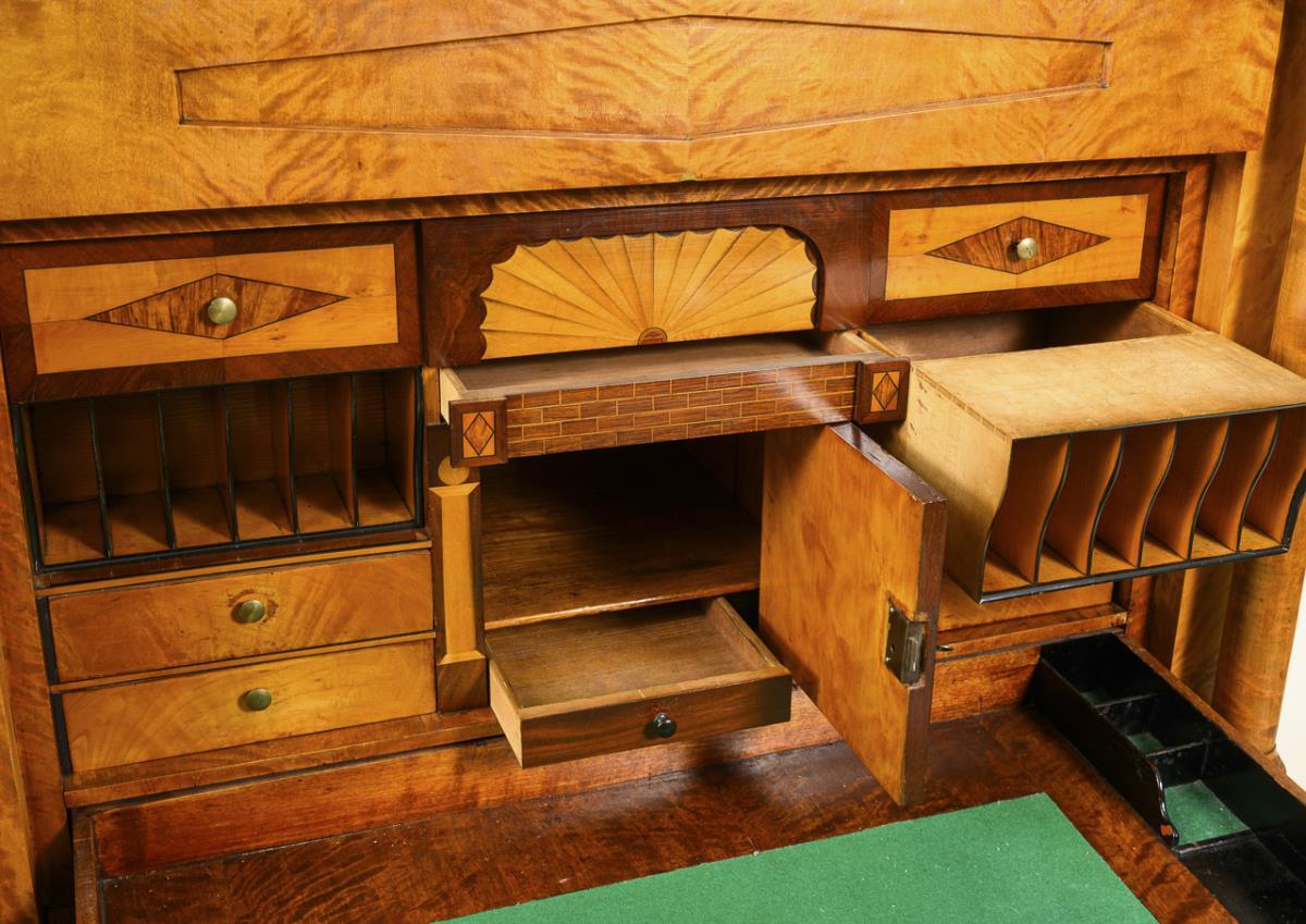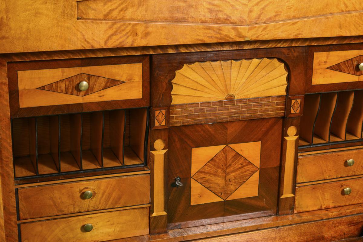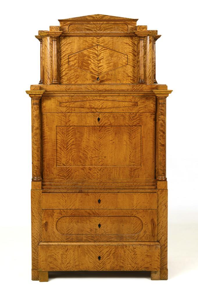 Architektonisch gegliederter Aufsatzsekretär mit 3-schübigem Kommodenunterteil, Schreibklappe, verstecktem Kopfschub und 1-türigem Aufsatz; verziert mit gespiegeltem Maserfurnier und vorgesetzten Säulen; Schreibfach innen mit herausziehbarer Schreibplatte mit integriertem Gefache und elegantem Eingerichte mit architektonisch gestalteter Front, 1 verschließbarem Fach mit inliegendem Schub, 4 kleinen Schüben und 1 größeren Schub, 1 versteckter Schub, 2 offene 6-fach geteilte Fächer zum Herausziehen mit rückseitigem Geheimfach; Kopfschub mit integriertem Innenfach mit Deckel und Einsatz mit offenen Fächern. Alters-/Gebrauchsspuren, Trockenrisse, teils Ergänzungen und fehlende Leisten, Schlösser defekt und teils ergänzt, Klappe schließt nicht.