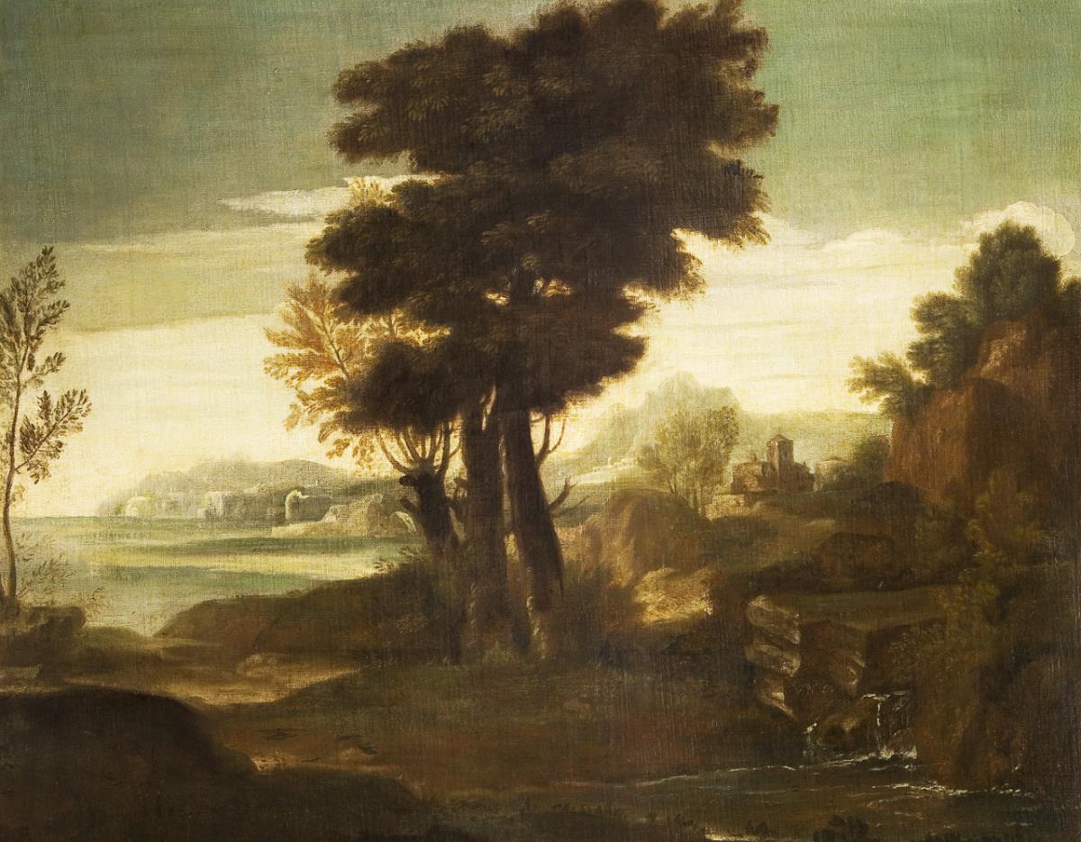 Romantische, kulissenhaft in die Tiefe gestaffelte Ansicht mit zentralem Baummotiv, Architekturstaffage und kleinem Wasserfall im Vordergrund. Keinerlei Figuren machen die Priorität der Natur als malerischen Gegenstand streitig. Neuwertiger Flammleisten-Rahmen. Doubliert.