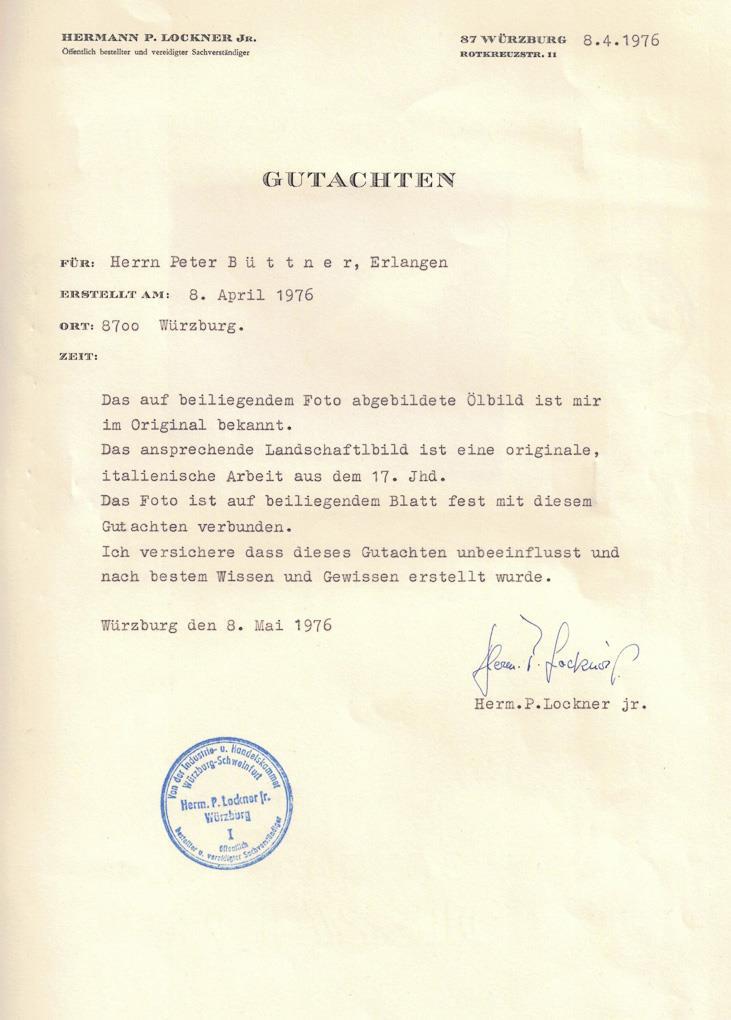 Gutachten von Hermann P. Lockner, Öffentlich bestellter und vereidigter Sachverständiger, Würzburg 1976 * Partnerauktion Bergmann.