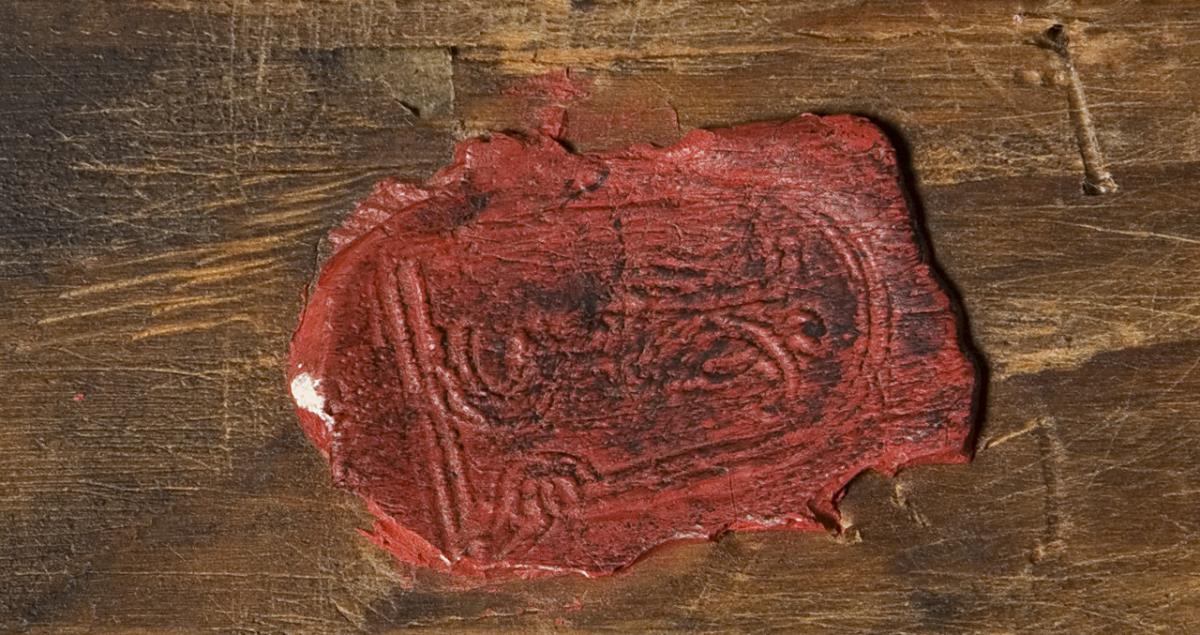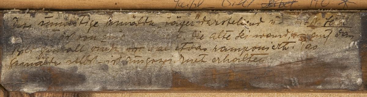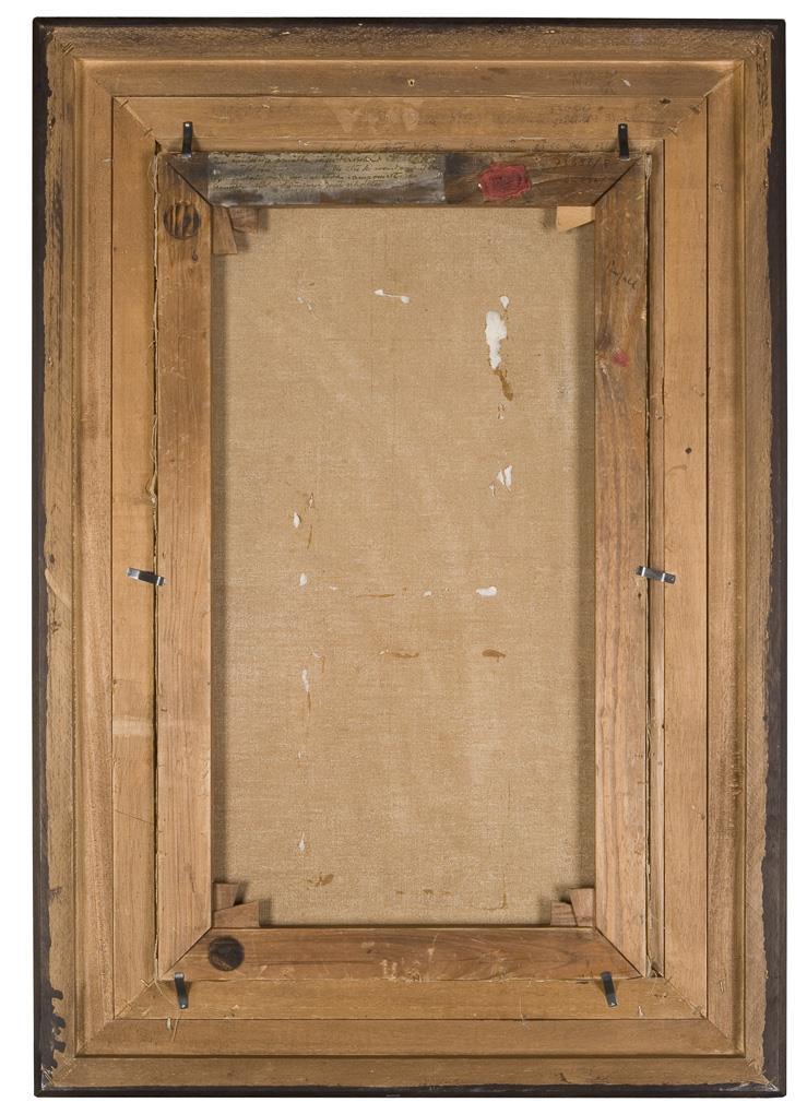 Rückseitig alter handschriftlicher Klebezettel, Siegel. Neuwertiger Flammleisten-Rahmen.