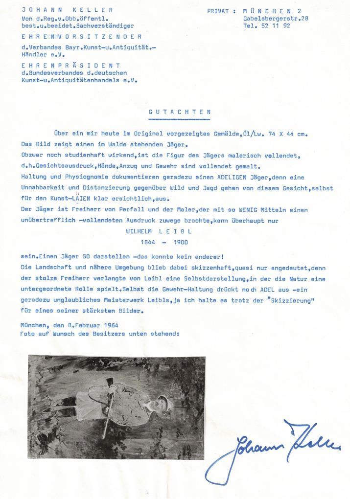 Gutachten von Dr. Eberhard Hanfstaengl, Generaldirektor a.D. der Bayrischen Staats-Gemäldesammlungen München, zur Zeit, Zürich, 1961. Gutachten von Johann Keller, von der Regierung Oberbayern öffentlich bestellter und vereidigter Sachverständiger, München, 1964. Leibl, Maler, Zeichner, Radierer, studierte an der Akademie in München. Meisterschüler von Arthur Georg von Ramberg und Carl Theodor von Piloty. 1869 Ausstellungs-Debüt, 1870 in Paris, 1871 Begründung des Leibl-Kreises, 1891 Titular-Professor. Werke in zahlreichen internationalen Museen * Partnerauktion Bergmann.