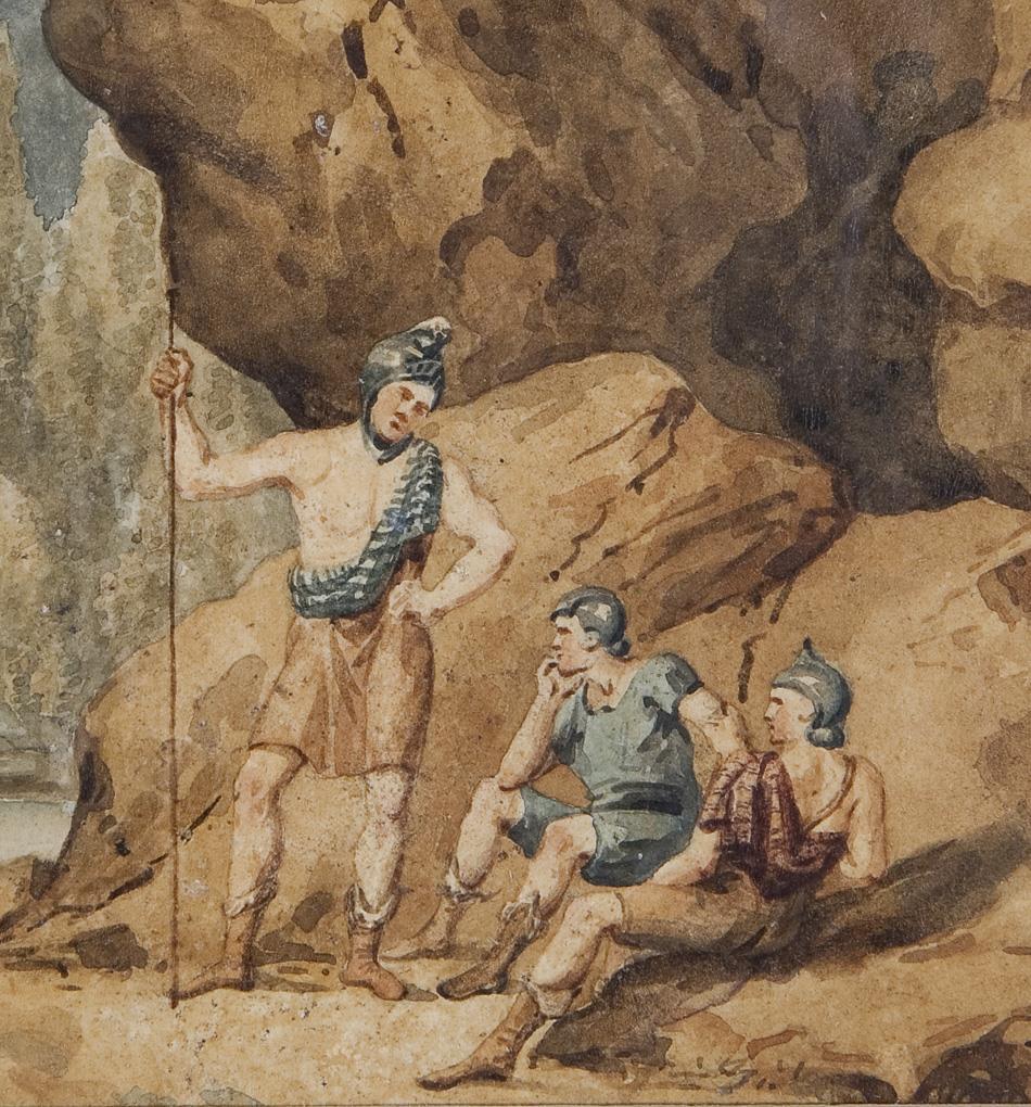 Landschaftsausschnitt mit seitlicher Heckenrahmung und Figurenstaffage. Die Felsen im Vordergrund sind in einer Palette warmer Brauntöne, die hintere Formation in Schiefergrau gemalt. Passepartout, verglaster profilierter Goldrahmen.