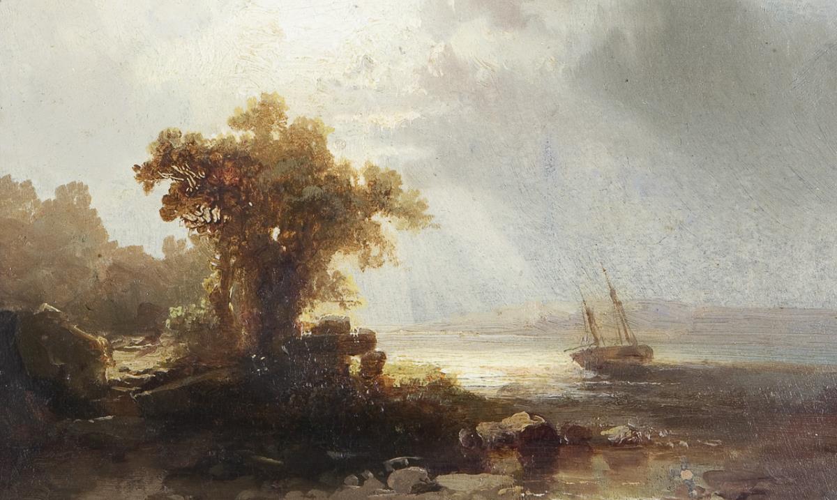 Romantischer kleinformatiger Landschaftsausschnitt in warmen Brauntönen mit eindrucksvollem Lichteinfall der Sonnenstrahlen. Neuwertiger Profilrahmen. Farbabplatzer am unteren Rand.