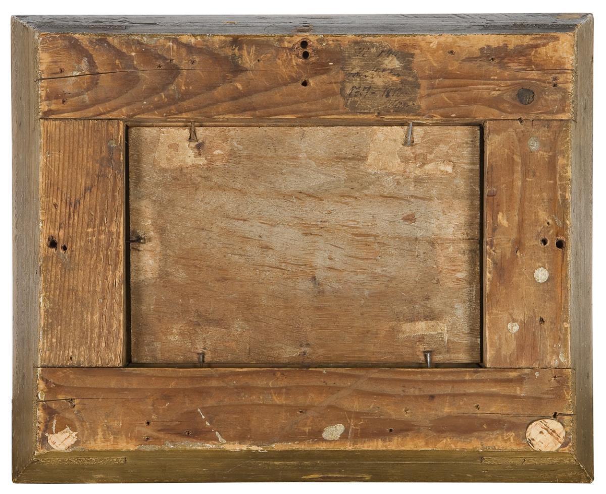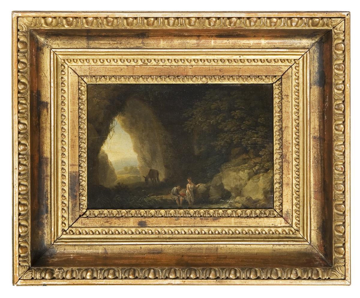 Romantische Landschaft mit Vieh- und Personenstaffage. Rückseitig auf einem alten Klebezettel bezeichnet. Breiter Original-Rahmen, restvergoldet.