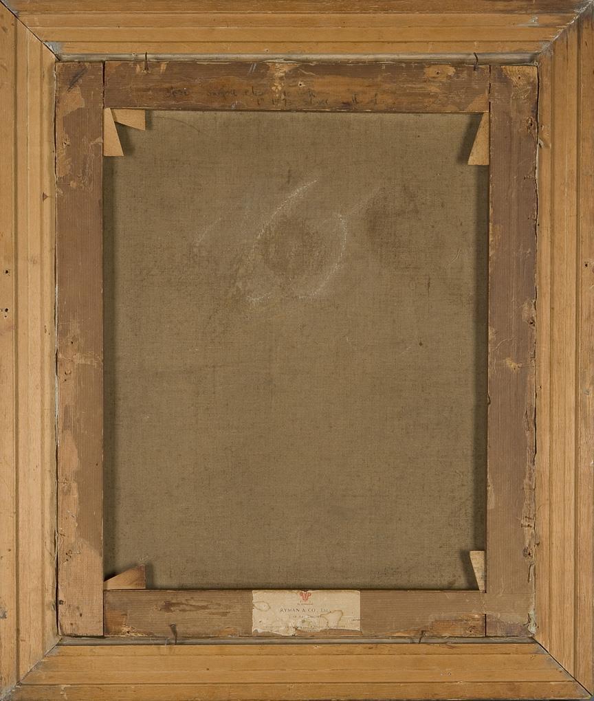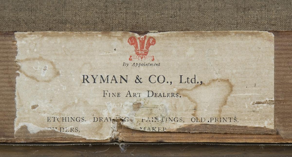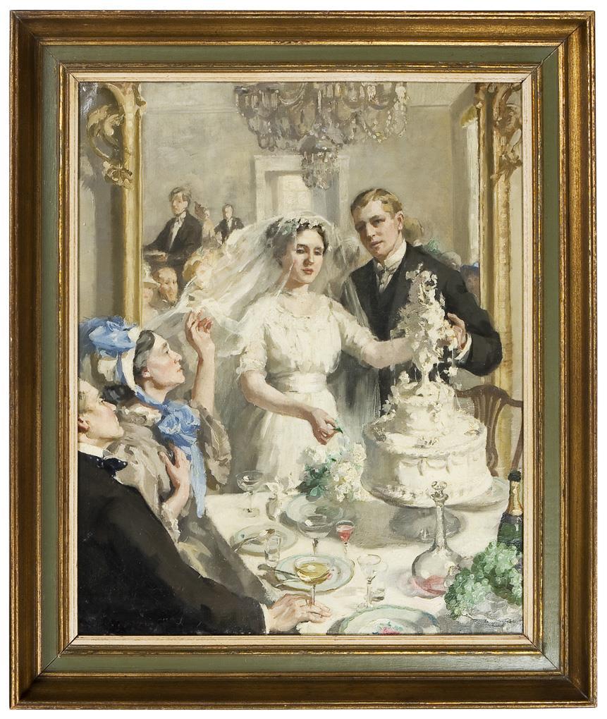 Vielfigurige, überaus detailreich gemalte, impressionistisch angelegte Szene in hellem Kolorit. Neben dem jungen Brautpaar die offensichtlich bewegten Brauteltern, im riesigen Wandspiegel erblickt man den Rest der Gesellschaft nebst Bedienung. Auf dem Keilrahmen alter englischer Klebezettel: Ryman & Co., Ltd., Fine Art Dealers. Profilierter Rahmen, goldfarben-graugrün-weiß gefasst.