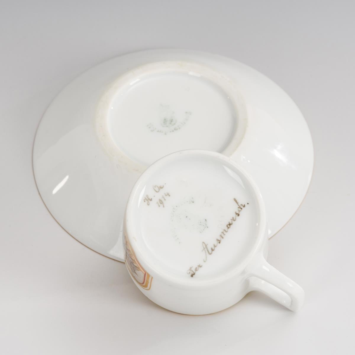 Polychrom bemalt, goldstaffiert. H Tasse 5 cm, Ø originale Untertasse 9,5 cm.