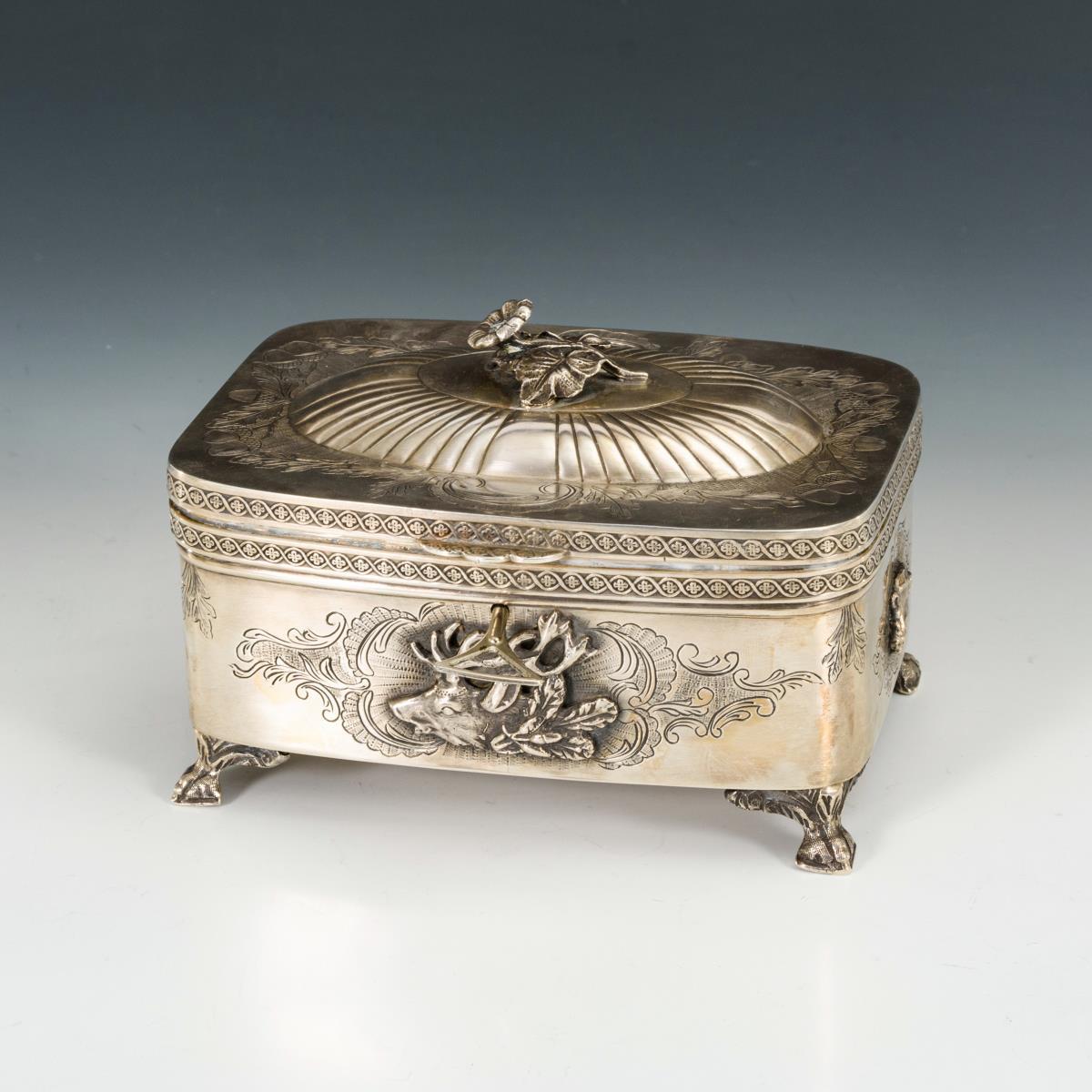 Schwere, reich gravierte Dose mit aufgelegten Jagdmotiven (Hirsch, Fasan und