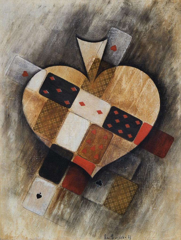 Ein Patience-Kartenspiel mit Eichel, Blatt, Herz und Karo. Ein Kartenspiel zur Konzentrationsübung mit viel Geduld, Strategie und manchmal auch nur Glück. Rückseitig kyrillischer Klebezettel. Profilierter Rahmen weiß-schwarz-gold gefasst.