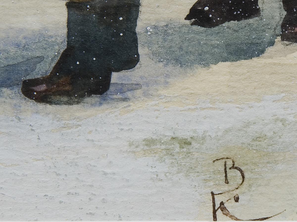 Verschneite Ansicht mit diversen Fahrzeugen und Personen in einem excellenten Kolorit. Passepartout, verglaster Wechselrahmen.