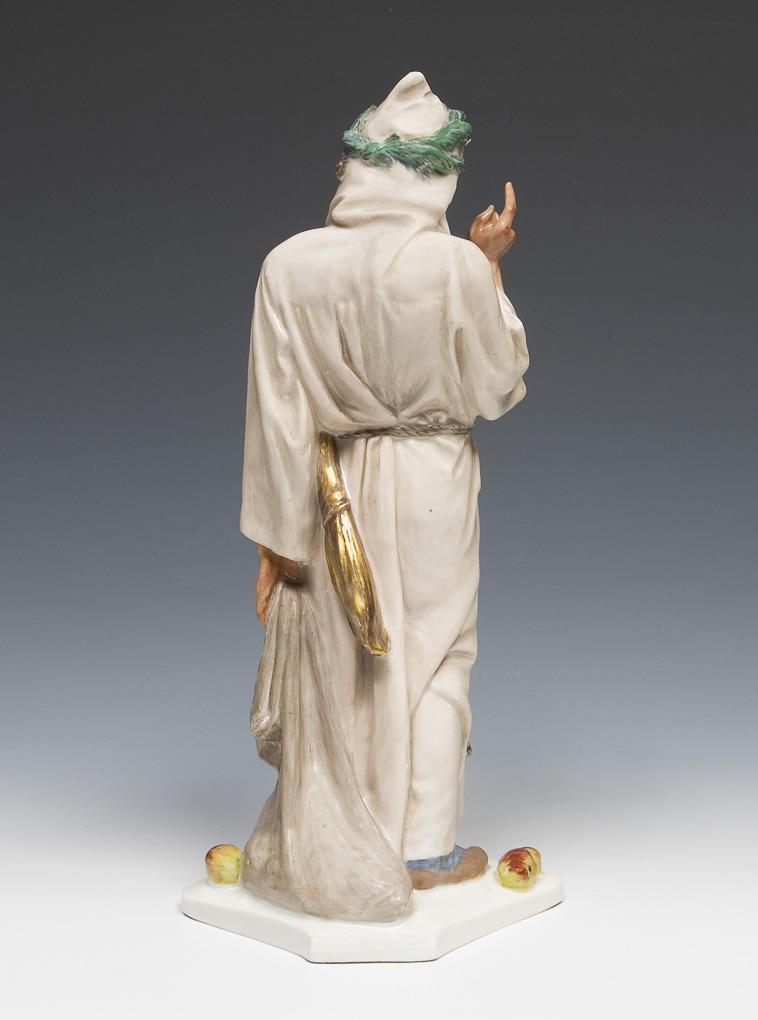 Modell von Martin Wiegand 1906. Farbig bemalt, gold staffiert. Ritzmarke, Pressmarke, Malermarke, Schwertermarke, Künstler-Signet. Minimaler Glasurdefekt.