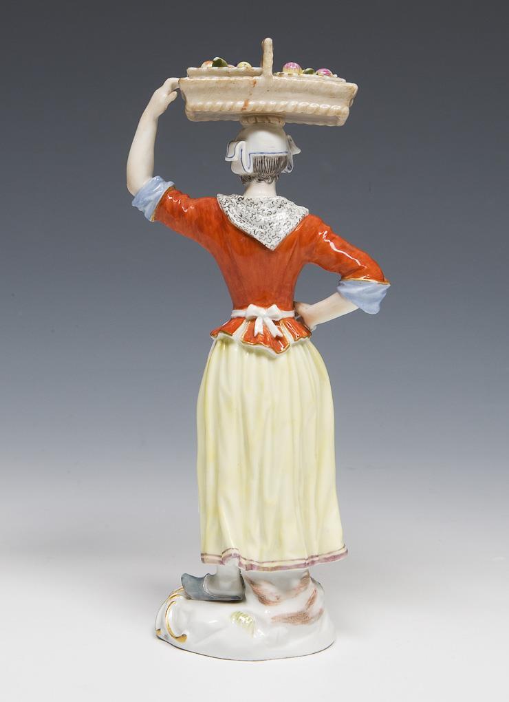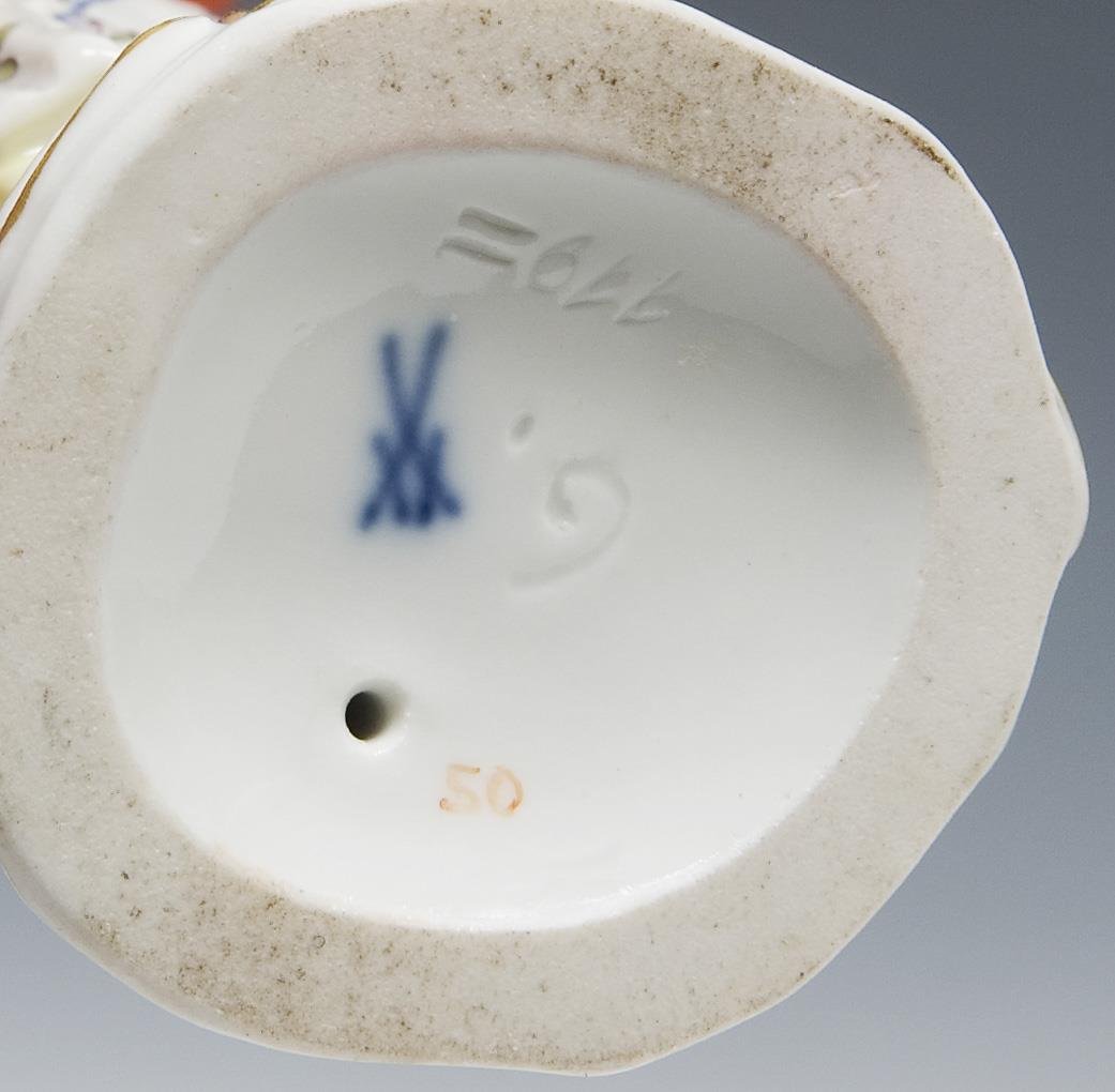 Modell von Peter Reinicke 1753-1754. Aus einer Serie von 34 Figuren. Farbig bemalt, gold staffiert. Ritzmarke, Pressmarke, Malermarke, Schwertermarke. Stand leicht uneben, drei Blättchen bestoßen.