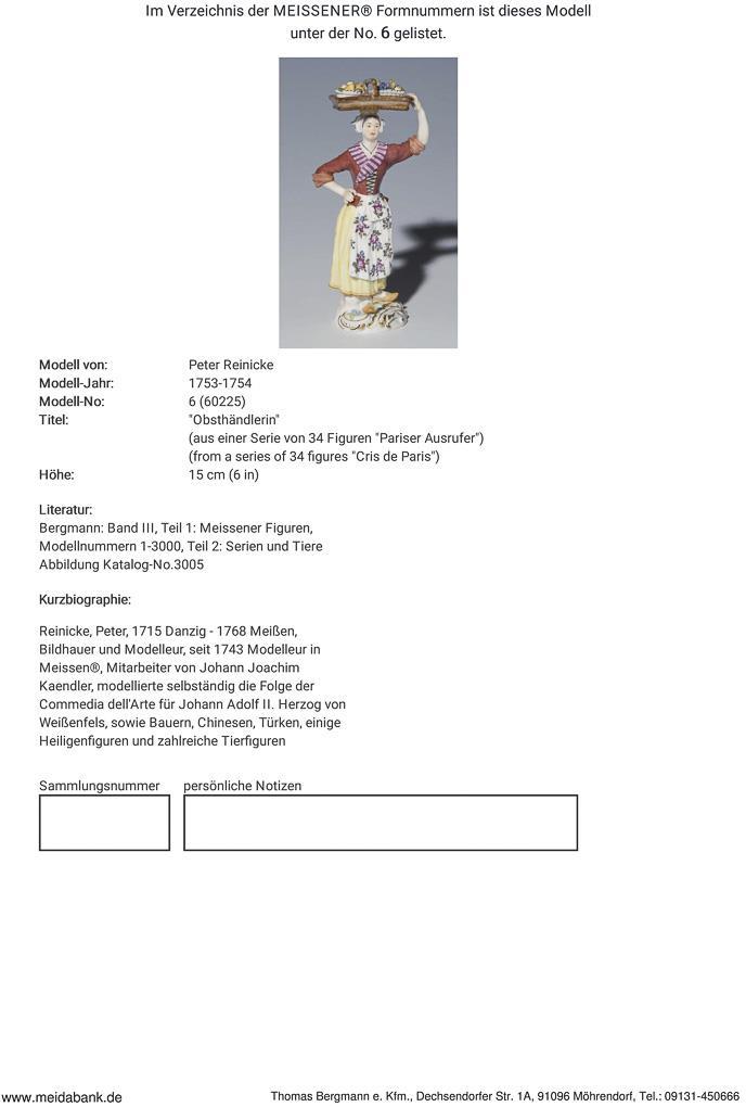 Reinicke, Bildhauer, seit 1743 Modelleur in Meissen. Schuf zahlreiche Figuren, Mitarbeiter von Johann Joachim Kaendler. Meissen-Manufaktur-Preis: 2990,- Euro * Partnerauktion Bergmann.