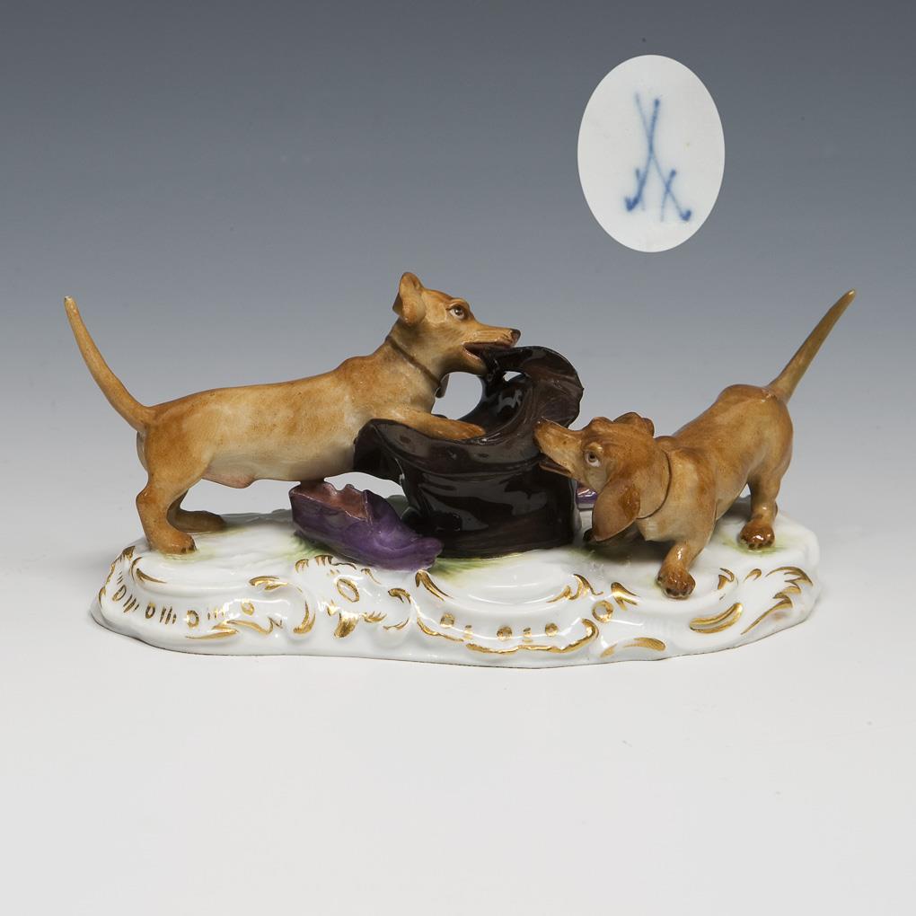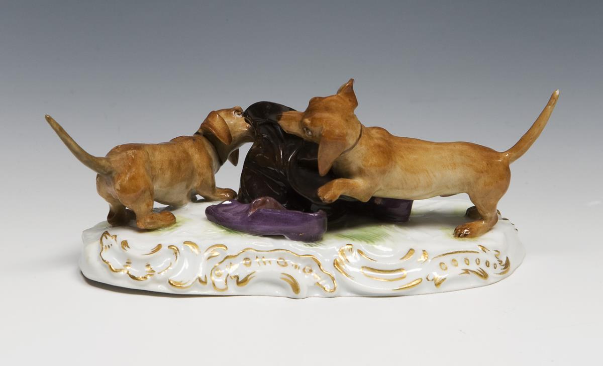 Dackel, mit einem Hut spielend. Meissen.