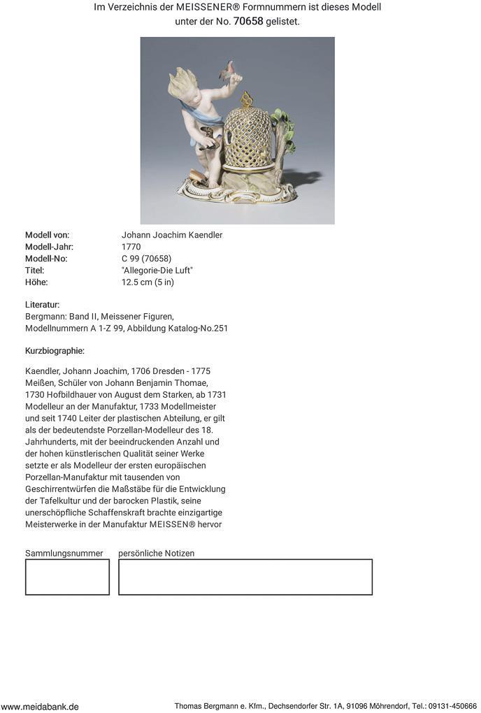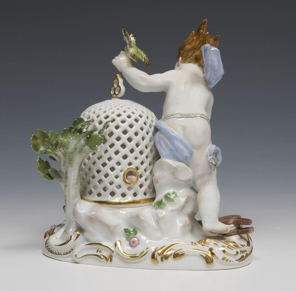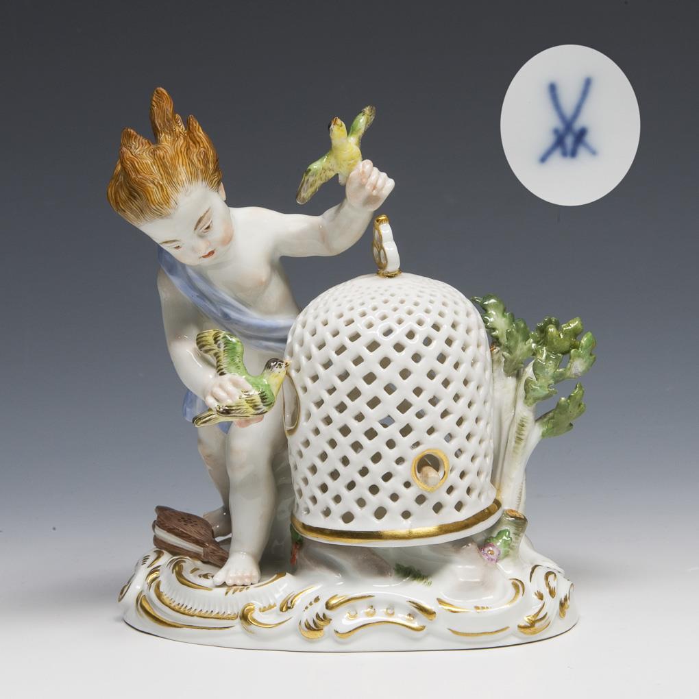 Kaendler 1770: "Ein neues grouppgen inventiret durch welches das Element der Lufft vorgestellet wird. Man Siehet einen genium mit Vogel und einen Vogelgebauer nebst Blase balg…". Meissen-Manufaktur-Preis: 4990,- Euro * Partnerauktion Bergmann.