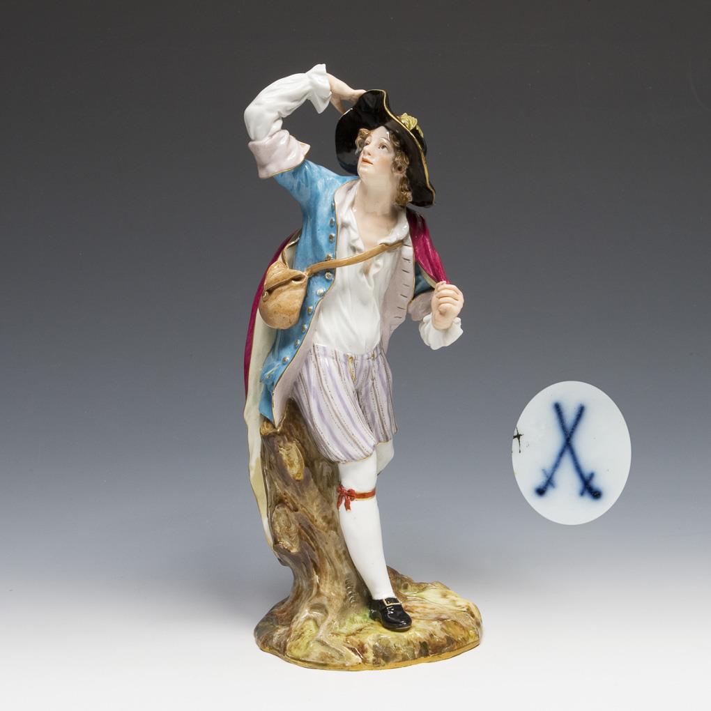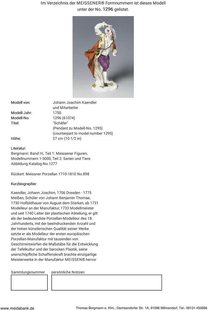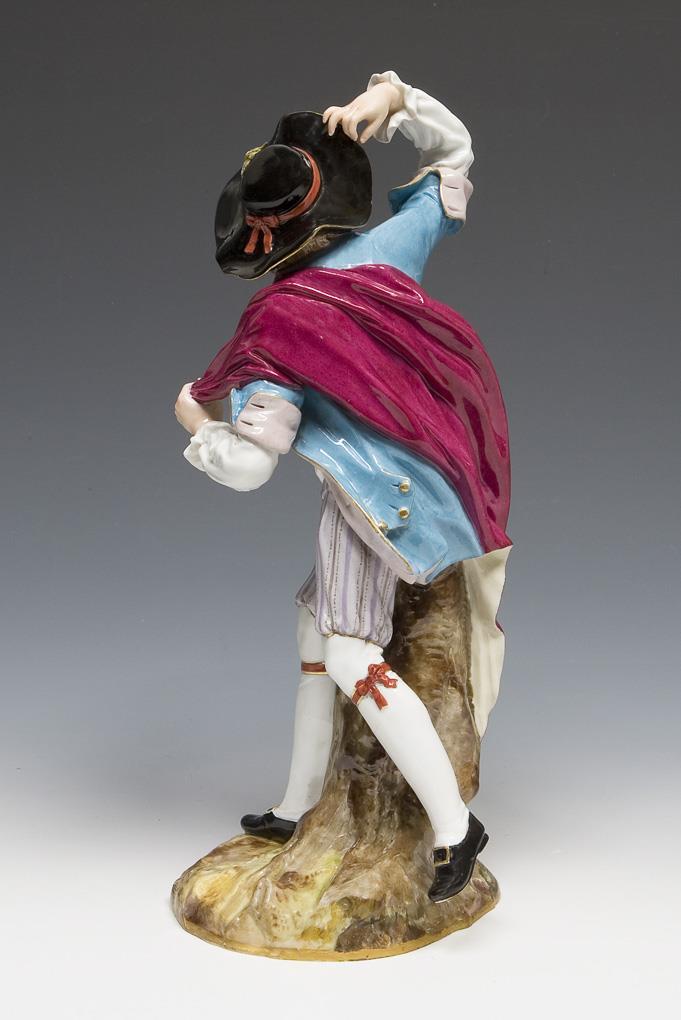 Modell von Johann Joachim Kaendler und Mitarbeiter 1750. Pendant zu Modell-Nr. 1295. Farbig bemalt, gold staffiert. Ritzmarke, Pressmarke, Malermarke, Schwertermarke. Ein Henkel, eine Umhangkante, eine Rockecke, Sockelrand partiell, restauriert.