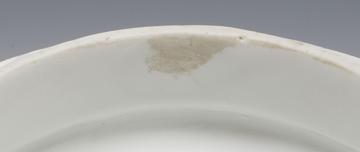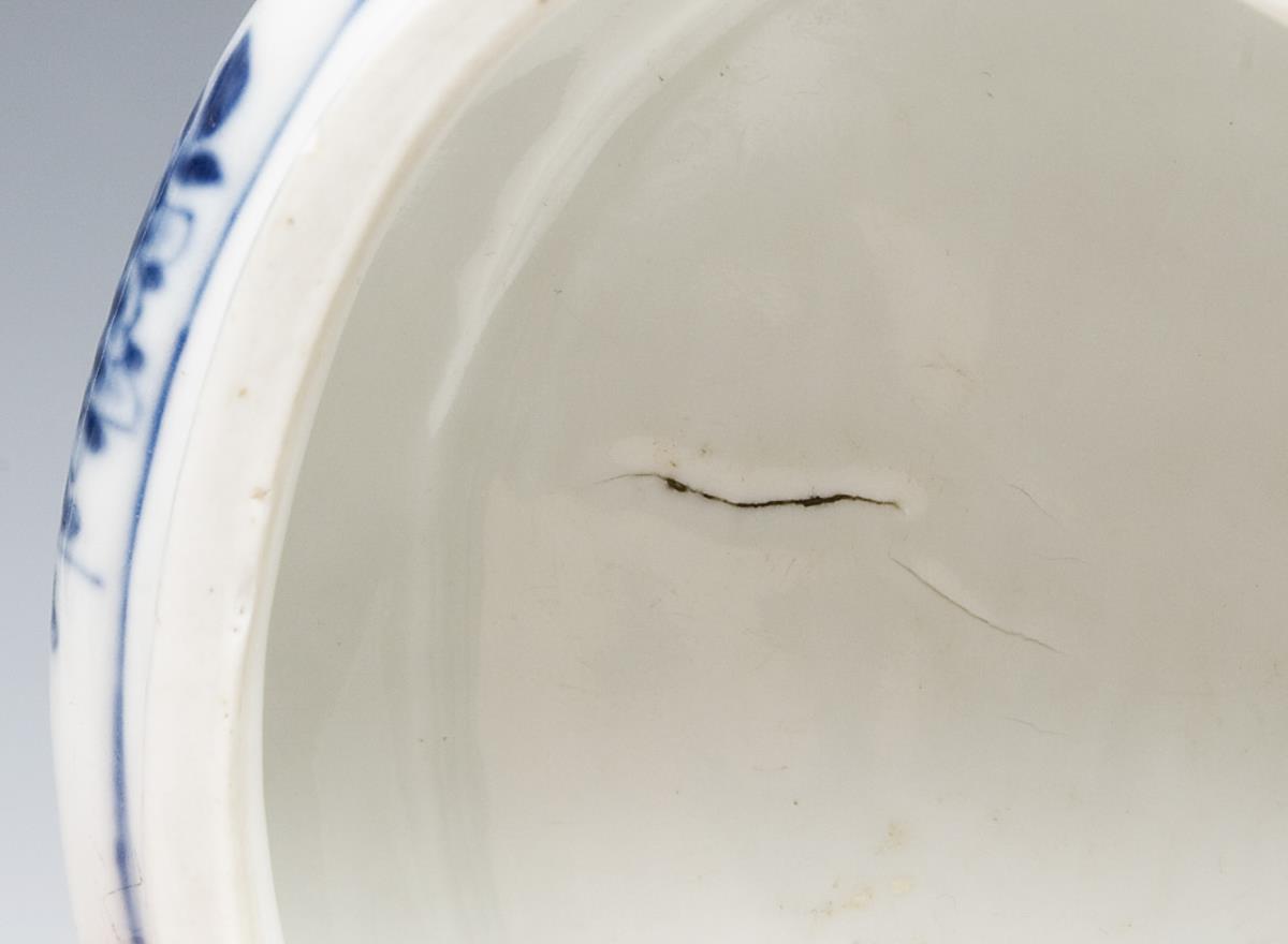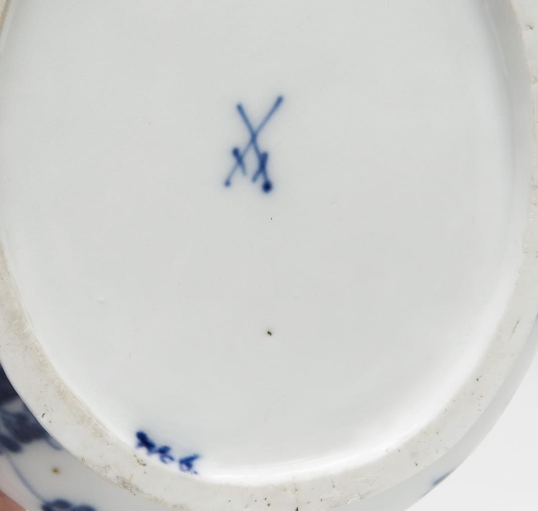 Kobaltblaue Unterglasurmalerei, "Fels- und Blumendekor", Ornamentbordüre. Ovaler gebauchter Korpus, auf dem Deckel ein Kaninchen nach ostasiatischem Vorbild als Knauf. Malermarke, Schwertermarke. Deckelrand, Standring partiell restauriert, Mündungsrand minimal bestoßen.
