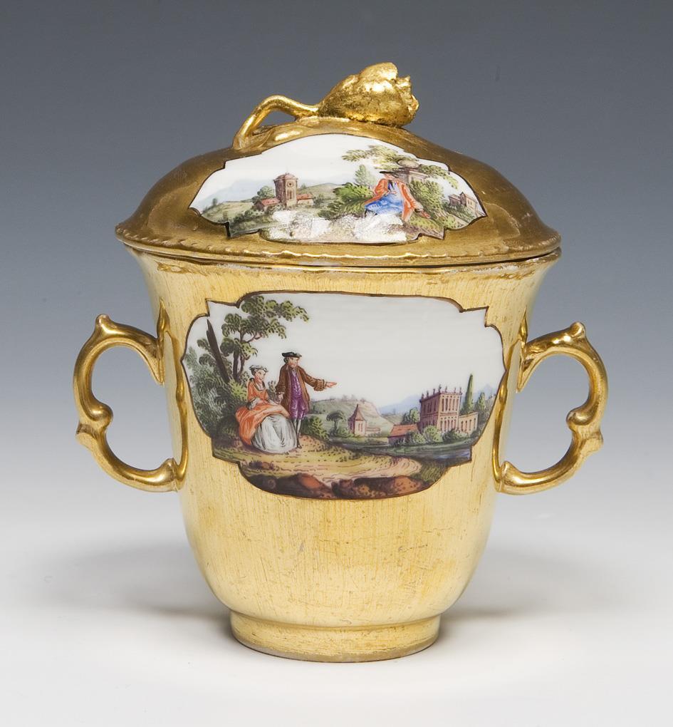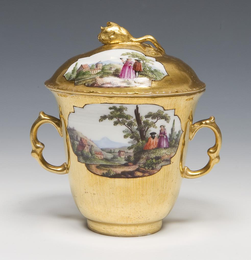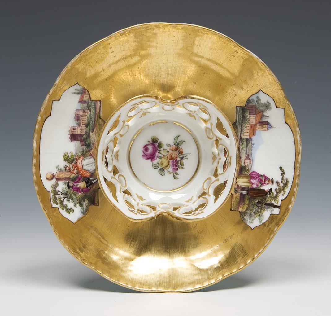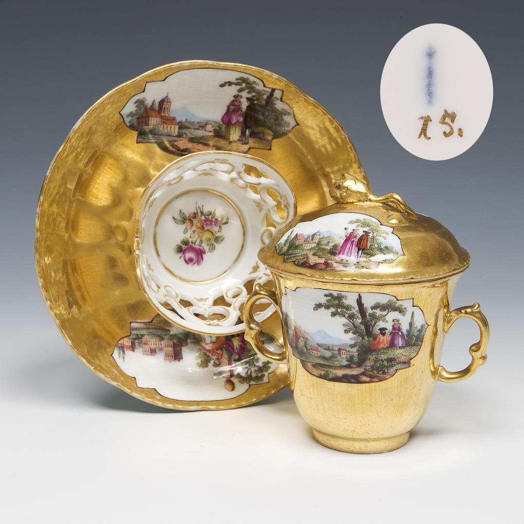 Feine farbige Bemalung, in sechs passig geschweiften Reserven "Galante Paare in Architekturlandschaften", im Untertassen-Spiegel Blumenbukett, Rückseite der Untertasse mit Türkisfond. Tasse in schlanker Becherform mit seitlichen Handhaben, gemuldete Untertasse mit symmetrisch durchbrochen gearbeitetem Korbeinsatz. Blaue Zeptermarken, goldene Malermarken. Deckel partiell restauriert.