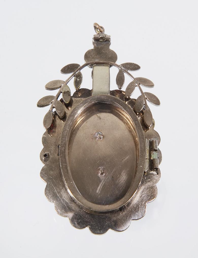 Vergoldete Fassung, rückseitig verglastes Medaillon, zum Öffnen. Dreistufige Form mit floraler Bekrönung, ehemals mit Nadel, auch als Brosche tragbar. Öse ergänzt.