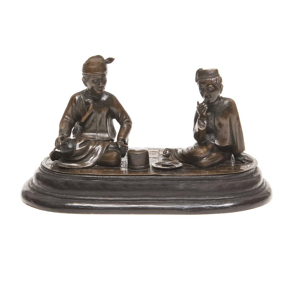 Fein modellierte vollplastische Zweiergruppe mit Gerätschaften. Montierte geschwärzte Holz-Plinthe.