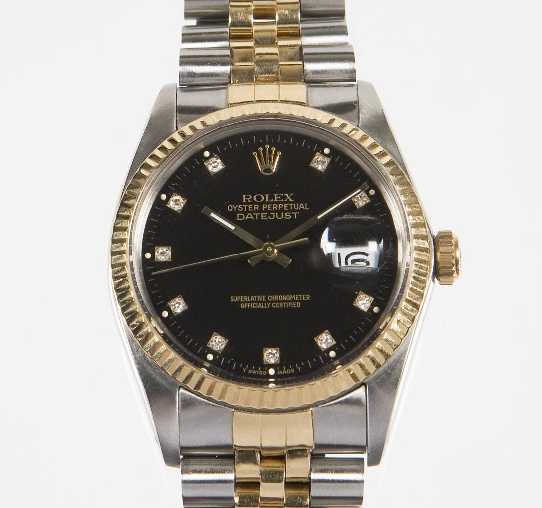 Superlative Chronometer Officially Certified. Automatikwerk, schwarzes Zifferblatt mit 10 Diamanten, große Sekunde, Datum-Fenster mit Lupe. Original-Jubilé-Armband mit Faltschließe. Grünes Rolex-Etui, Internationale Service-Garantiekarte, grünes Rolex-Kartenetui, Chronometer-Garantieschein W 366741 mit Stempel von Gerhard D. Wempe, Frankfurt am Main 1995. Service durch Wempe am 13.07.2021. Im Kurzeit-Test funktionstüchtig.