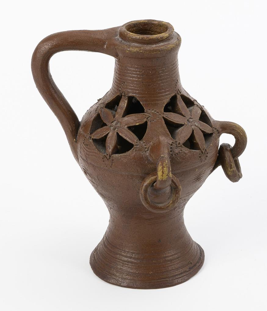 Barocker Scherzkrug mit einer von 3 Rosetten durchbrochenen, bauchigen Wandung mit feinen Querrillen und Kerbdekor, umlaufend 3 mit Ringen applizierte Ösen, Rundfuß mit Hohlraum, hoher gewinkelter Henkel mit Hohlraum, Saugöffnung an der Lippe.