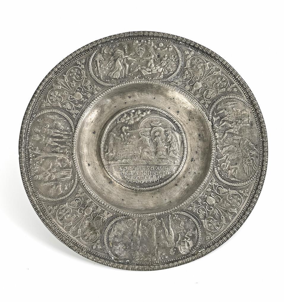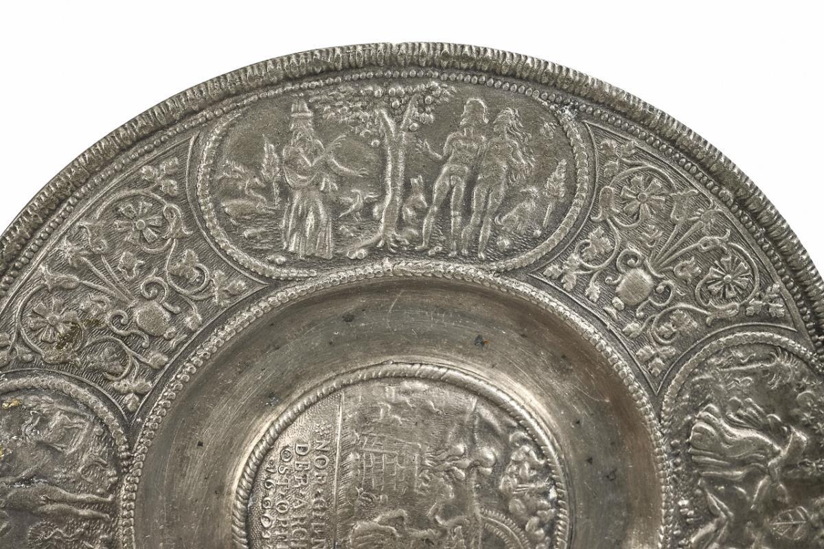 Noahs Dankopfer auf dem Spiegel und Beschriftung "Noe ging aus der Arch getrost, opferdt Gott 1619". Auf der Fahne 4 Kartuschen mit Adam und Eva, dazwischen Blütenvasen. Rückseitig Lötspur am Fahnenansatz, von vorn kaum sichtbar, berieben.