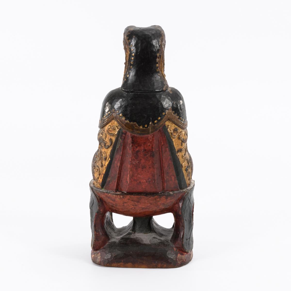 Aus einem Stück geschnitzte Figur, auf einem Thron im Verschränkungssitz