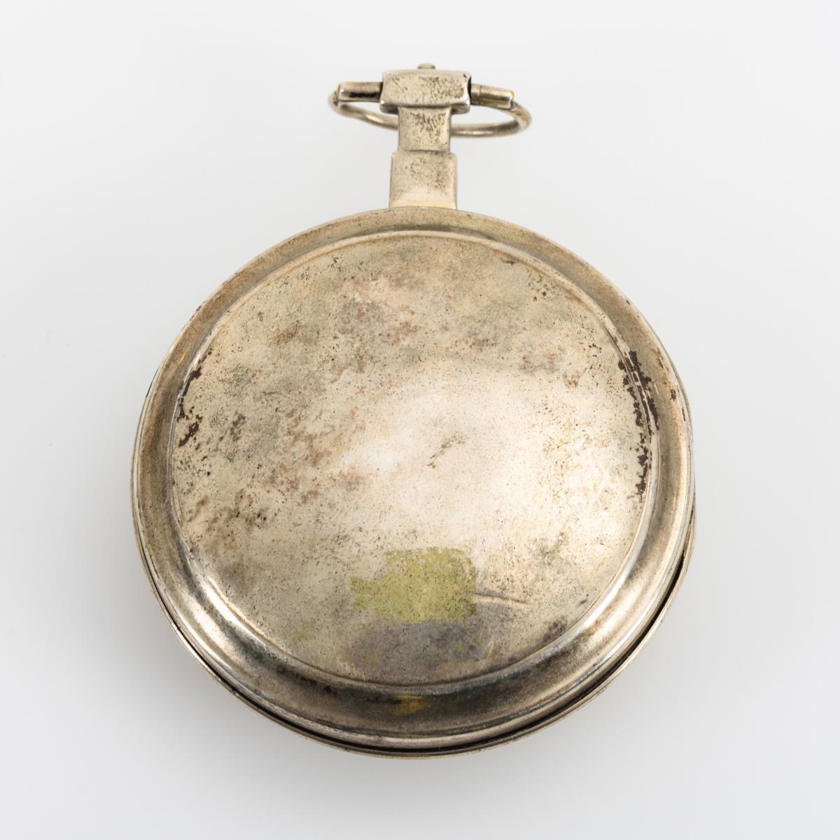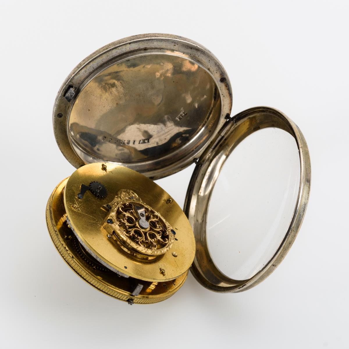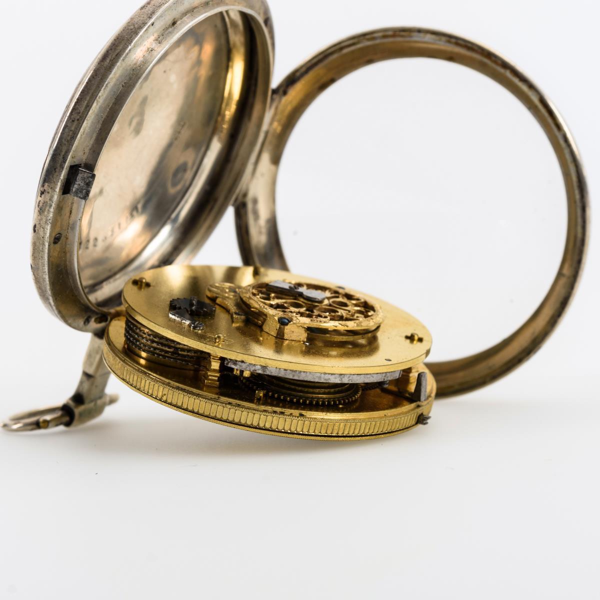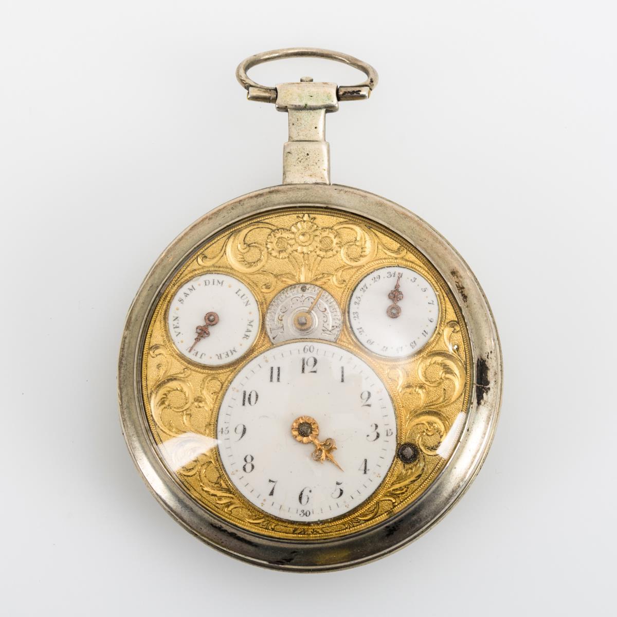Schwere silberne Spindeltaschenuhr mit Kalendarium.