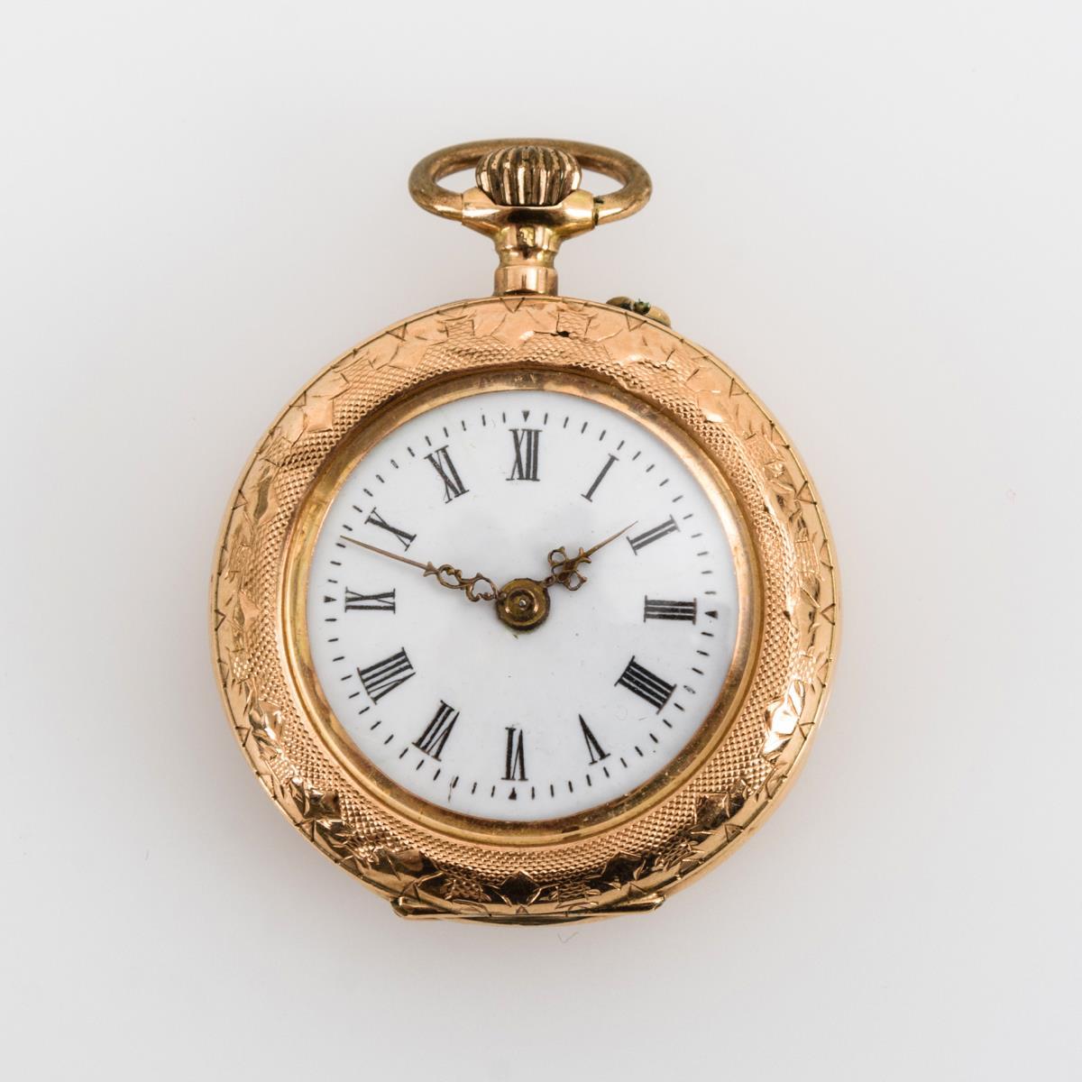 Gehäusenummer: 26142. Ungemarktes Werk mit Zylinderhemmung und Kronenaufzug. Weißes Emailzifferblatt mit römischen Zahlen, Minuterie und Louis Quinze-Zeigern.