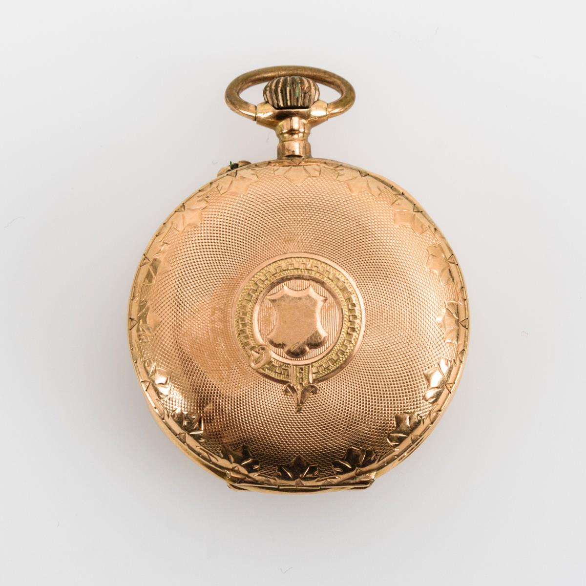 Guillochierter Rückdeckel mit leerer Wappenkartusche und graviertem Blattdekor. Werk ohne Revision, läuft nicht. Gehäuse partiell leicht gedellt, Zifferblatt minimal haarrissig.