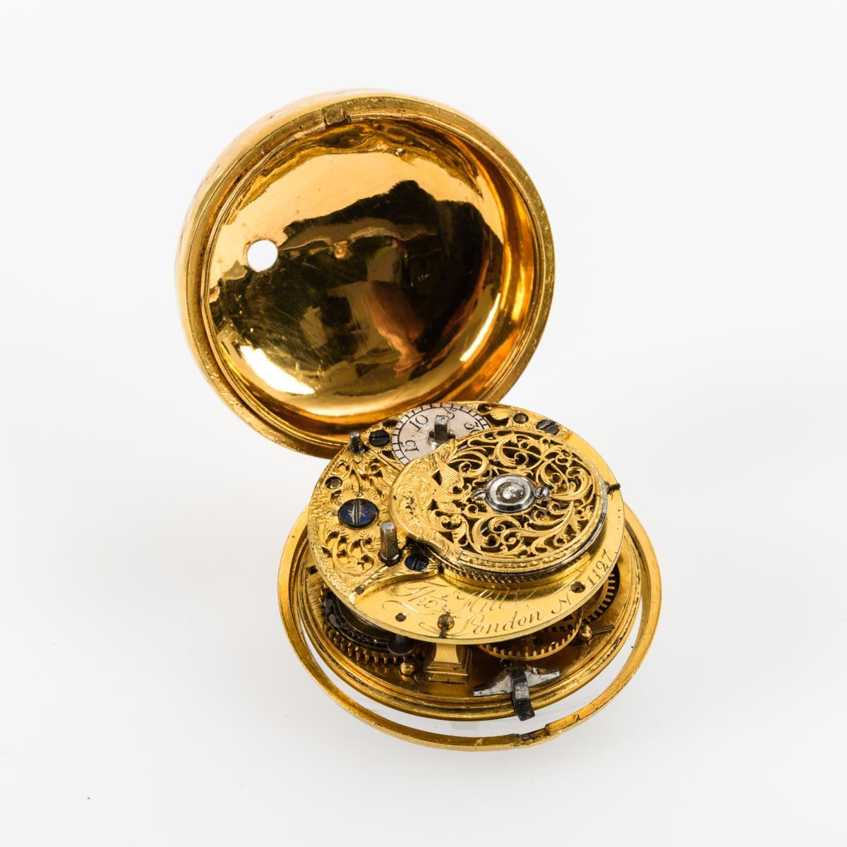 Werknummer: 1127. Graviertes Vollplatinenwerk mit floral durchbrochener Unruhbrücke, Spindelgang, Kette und Schnecke, Schlüsselaufzug. Herstellerprägung Werk: Thomas Hill, London. Weißes Emailzifferblatt mit arabischen Zahlen, Minuterie und Breguet-Zeigern.