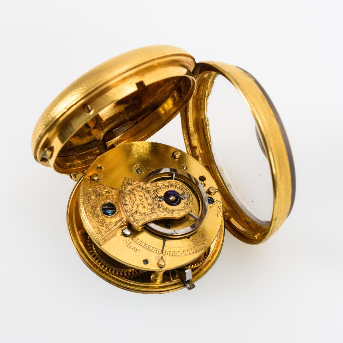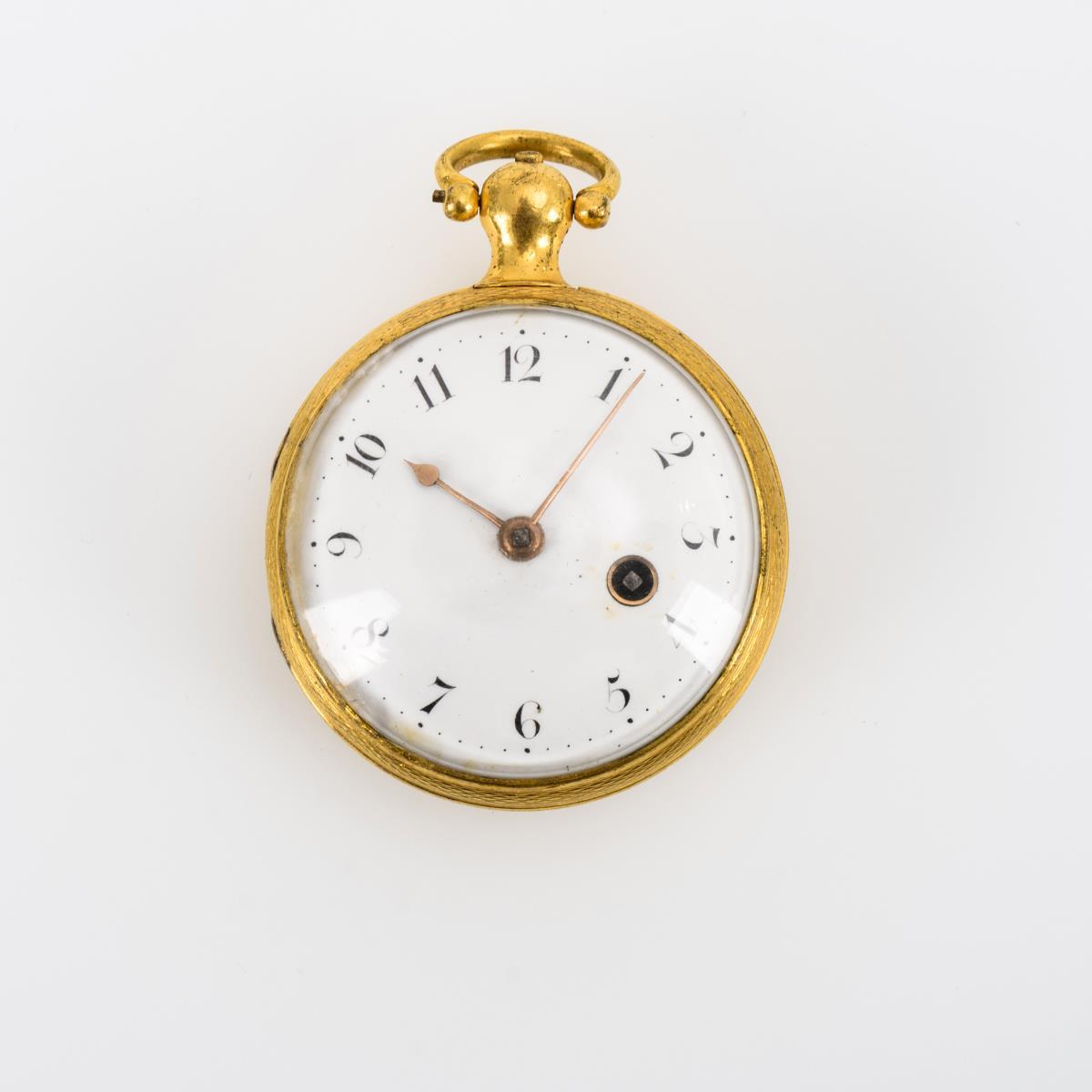 Englische Spindeluhr in vergoldetem Gehäuse.