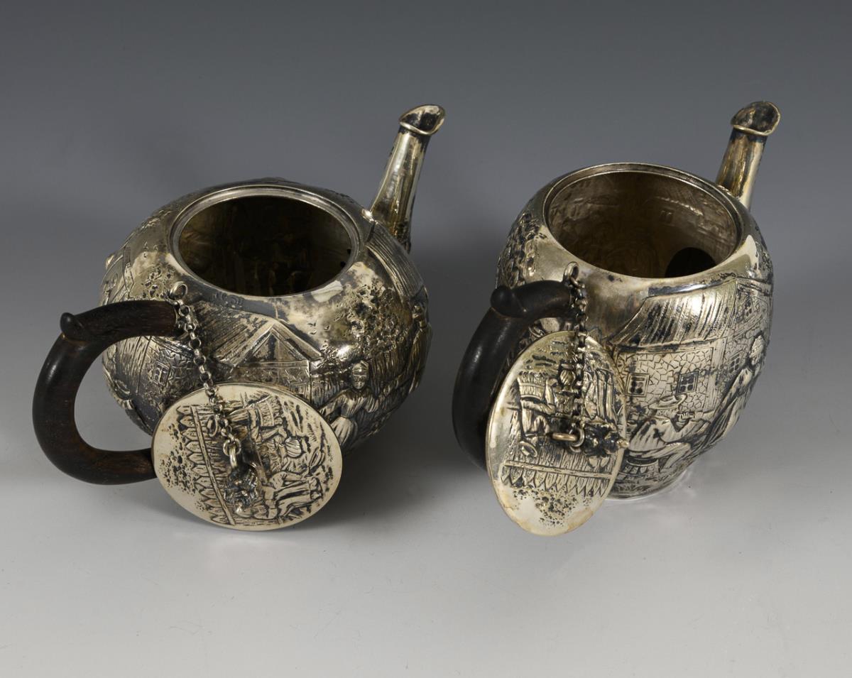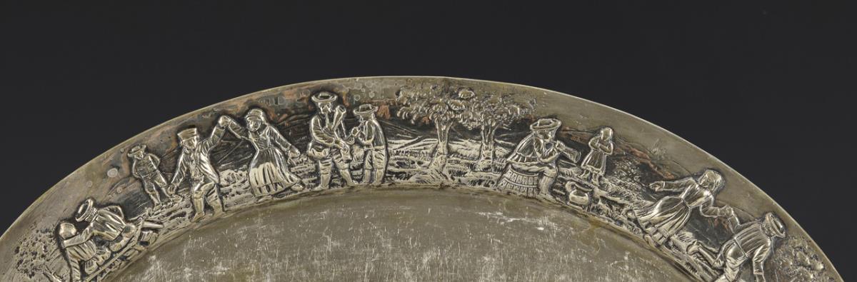 Figürlich reliefiert mit tanzenden Bauern: 2 kleine Kannen mit Holzgriff, runde Zuckerdose und Milchgießer, auf ovalem Tablett. Leichte Altersspuren.